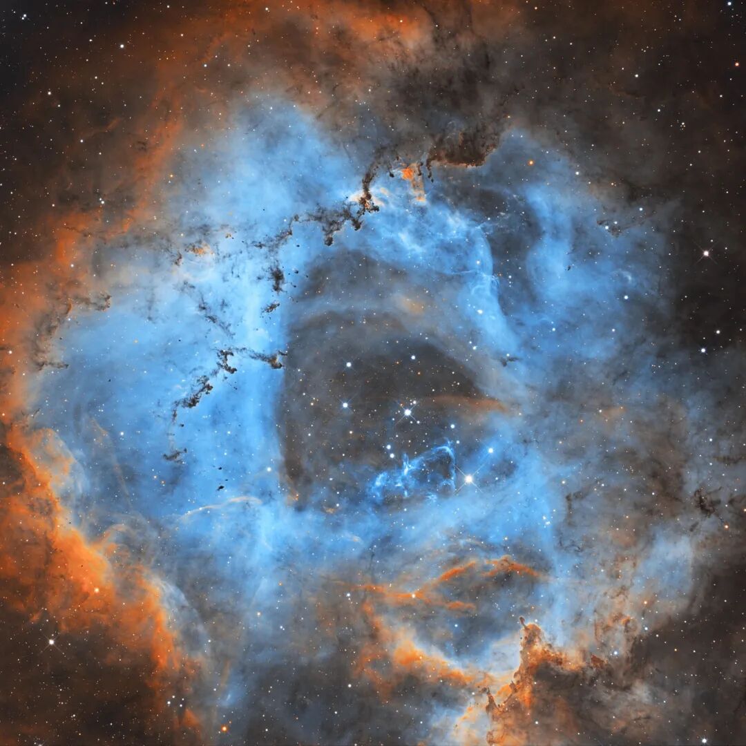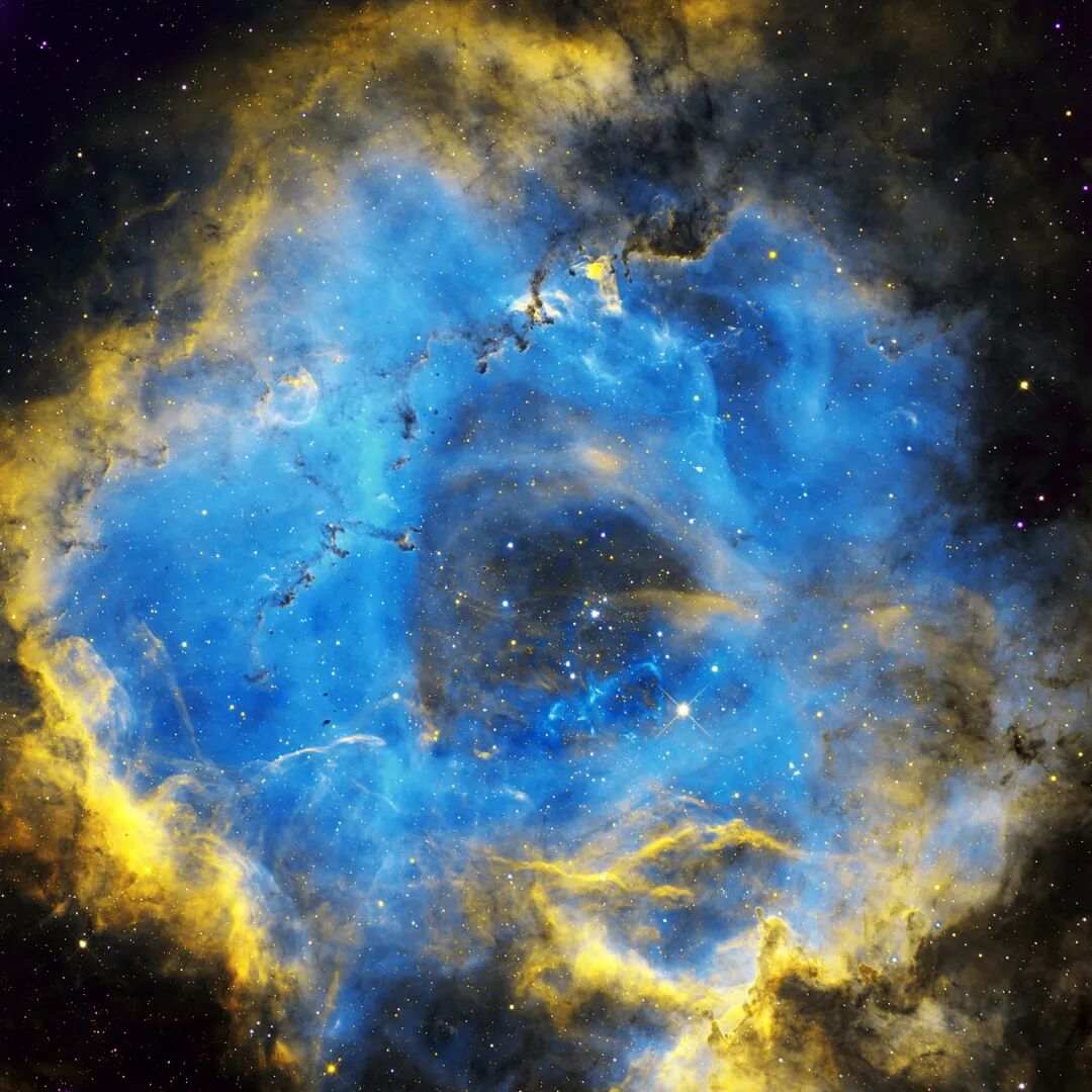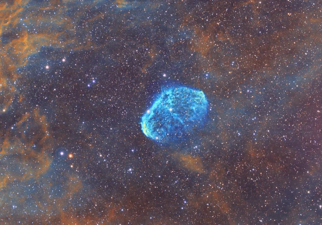NGC6888,又名为眉月星云,距离我们约5000光年,位于富含星云的天鹅座内。是一个宽约25光年的宇宙泡泡,由其中心明亮的大质量恒星的星风吹成。这幅多彩的宇宙肖像画利用了窄带并按哈勃调色板来进行合成。它分别用红,绿和蓝色光晕来显示来自硫,氢和氧原子的辐射。