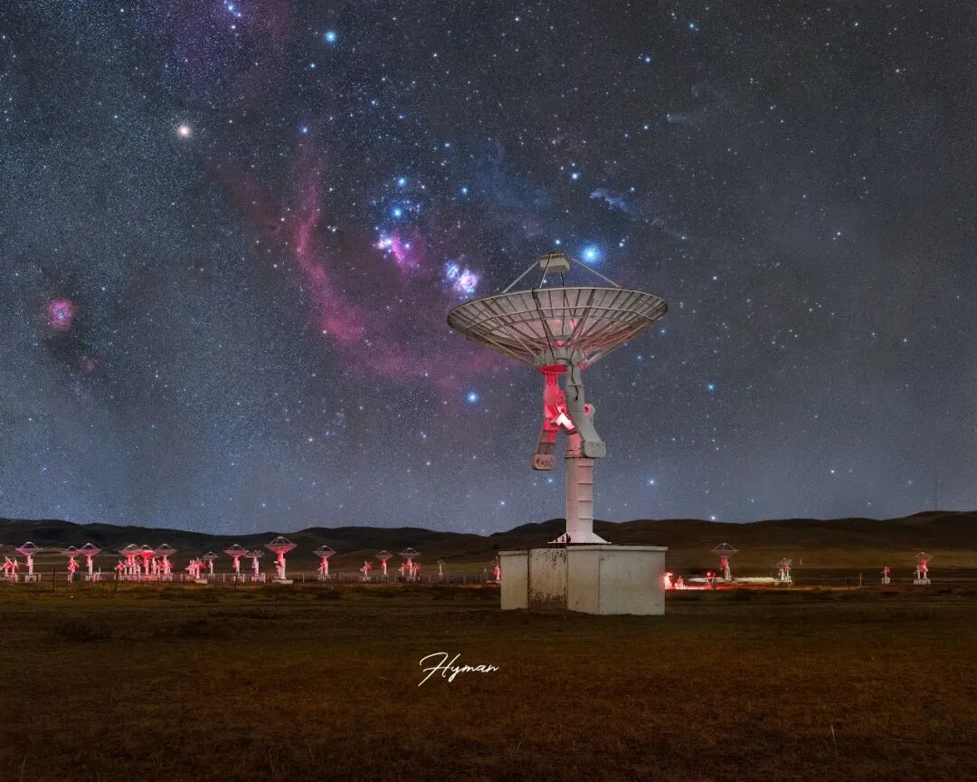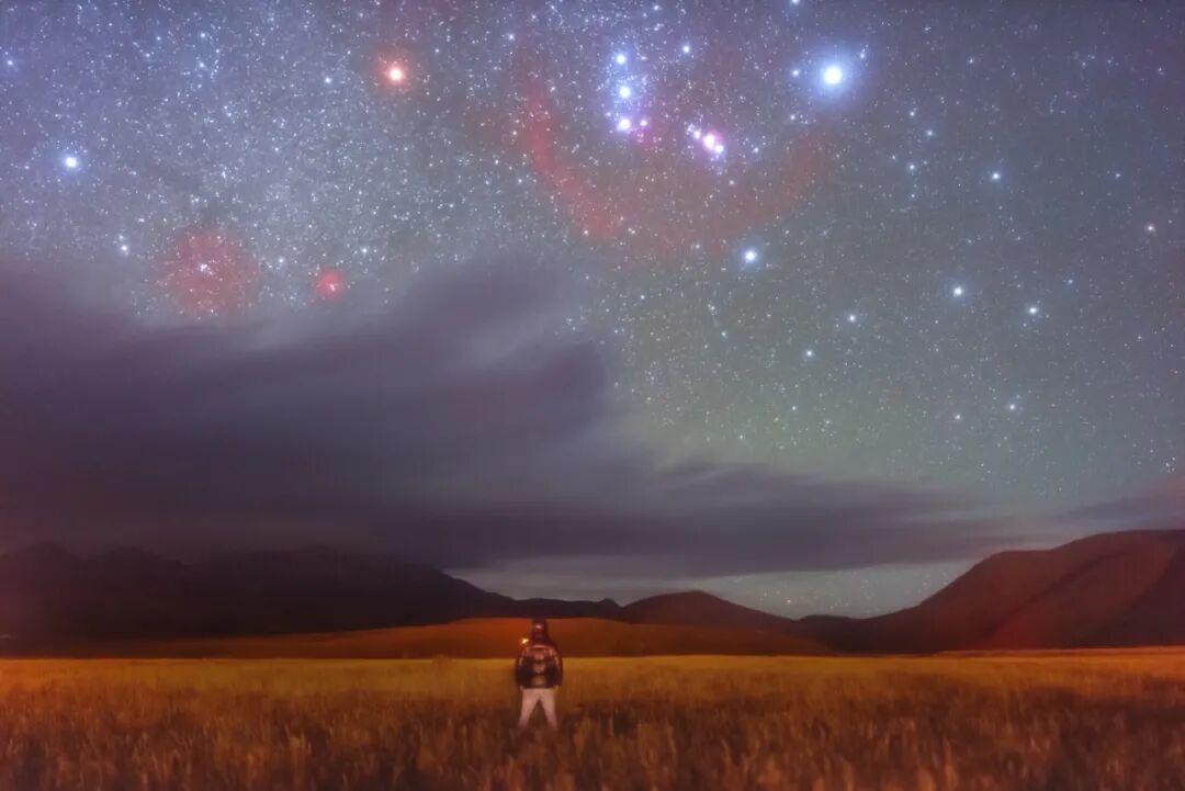 天空拍摄使用sigma 40 art镜头,信达大星野赤道仪,在猎户升起时刻开始拍摄,共拍摄21张,每张曝光180秒。之后手动马赛克(拼接),拍摄猎户周边星空6组,每组5张,每张180秒。拍摄地景时聚焦远处山体,光圈f8,900秒,变动聚焦环多次拍摄,得到地景4张。