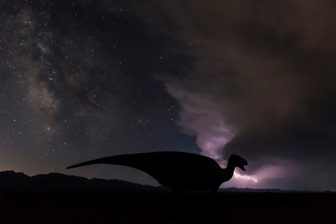 遥远的侏罗纪时期,夜晚星河璀璨,远处电闪雷鸣,乌云密布,一场大雨将至。