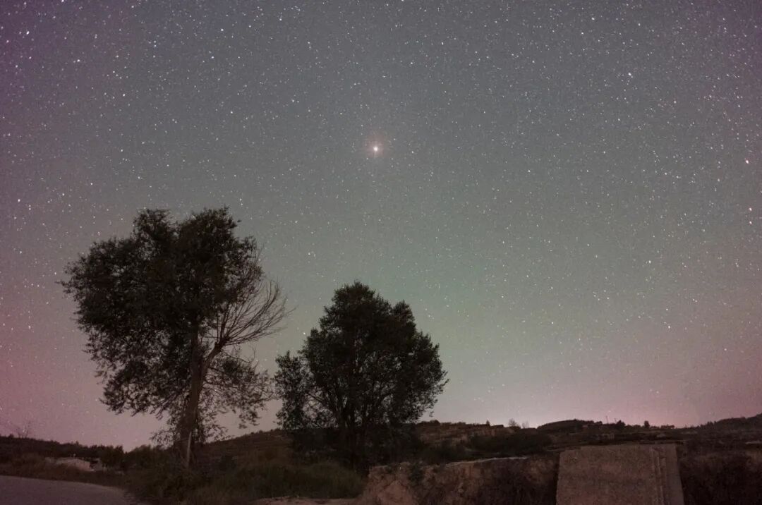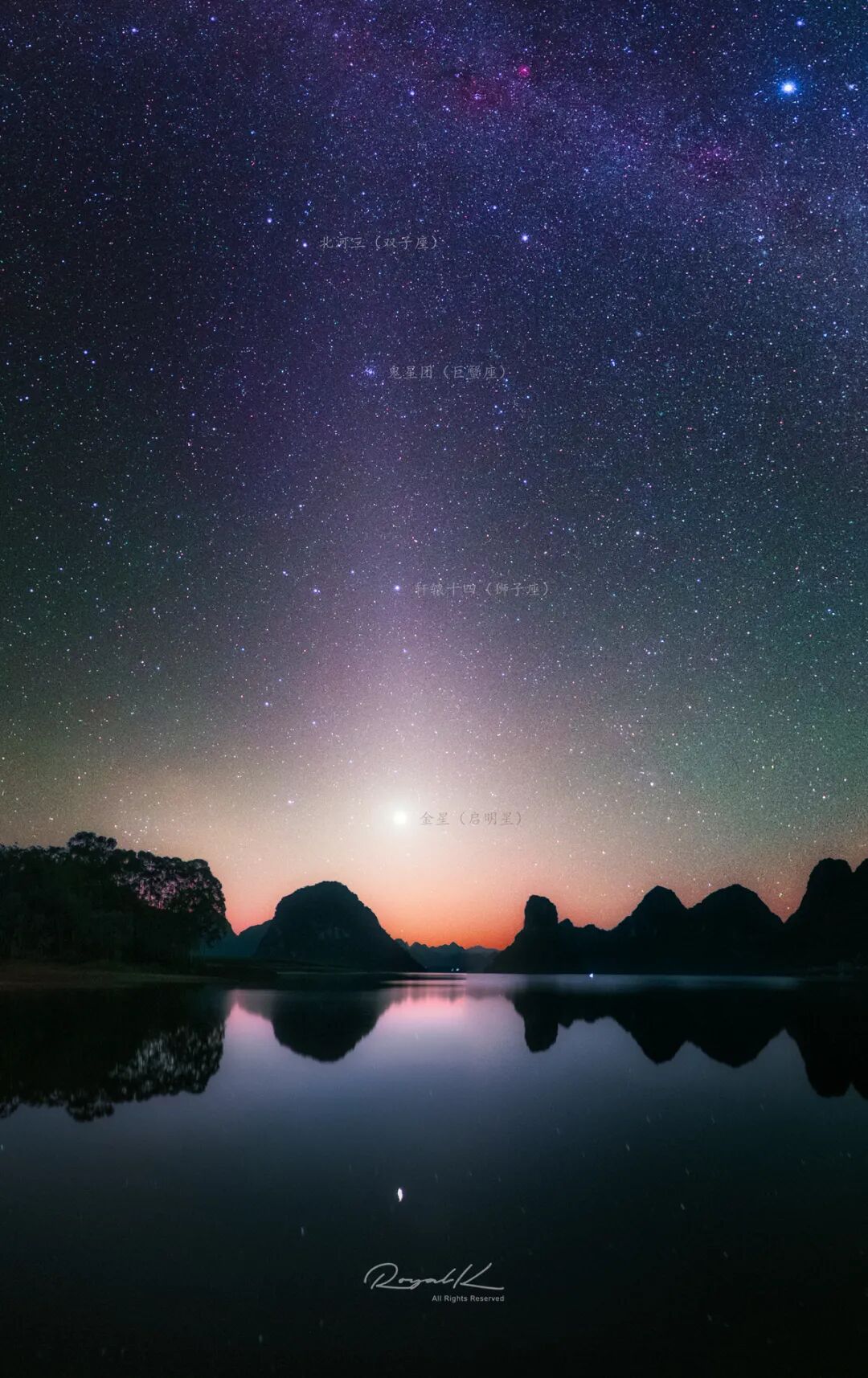 黎明前,东方地平线上空已经出现橙红色,黄道光贯穿明亮的金星和黄道星座,形成肉眼可见的几乎垂直地面的光柱,直达天顶。