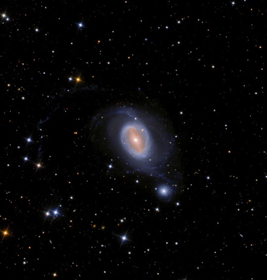 NGC1512和NGC1510这两个星系位于时钟座,距离我们大约3000万光年,NGC1512非常明亮,具有罕见的双环结构。