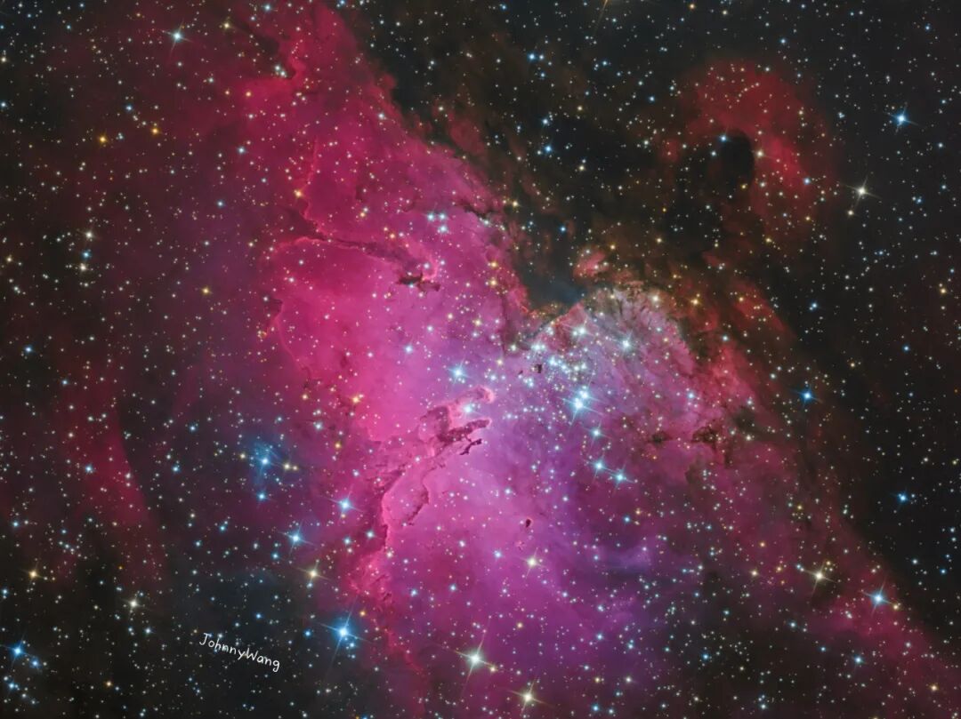 鹰状星云也称M16,位于巨蛇座,距离我们7000光年,它是银河系的一个恒星诞生区,因形状像一只展翅高飞的雄鹰而得名。鹰状星云是夏季银河中较为容易观测的天体。图片为HaLRGB合成作品,总计曝光约10小时。