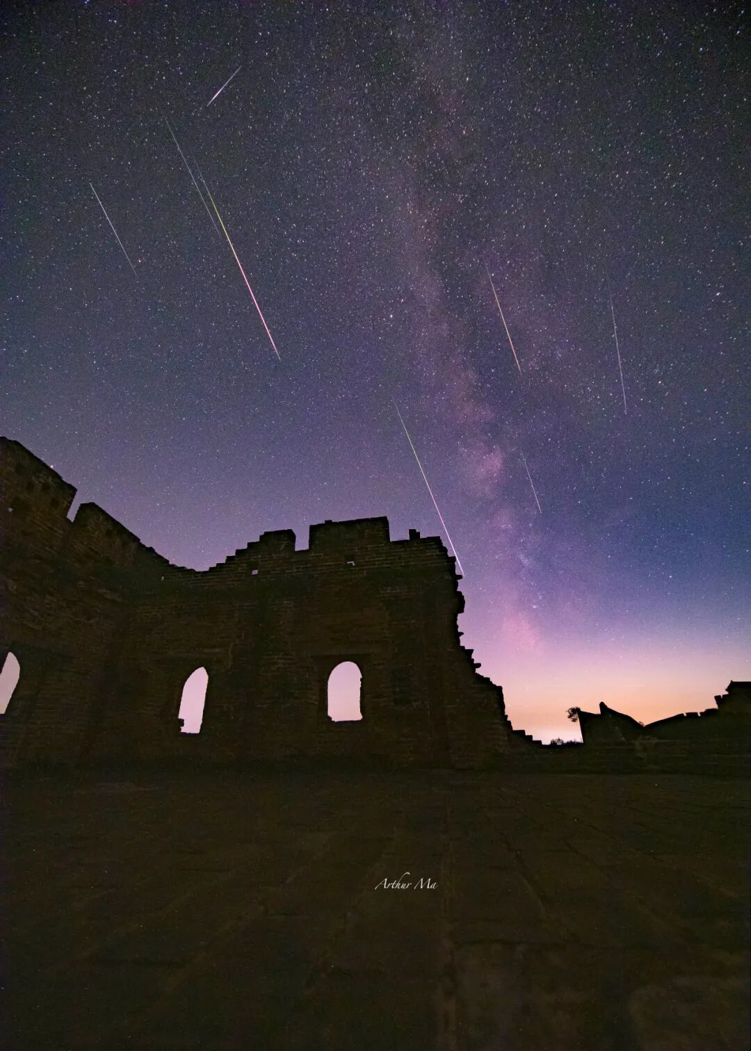 英仙座流星雨是北半球三大流星雨之一。按预报,2023年8月14日0-2点是其暴发流量最大的时刻。由于当天正值亏眉月,在整个流星雨观察期间都不受月光的干扰,是未来几年中观察窗口中最佳的一次。13日北京附近地域天空放晴,迎来了极为难得的拍摄窗口。流星雨是古老流星体进入地球外层大气形成的壮观场景,能与地面上古老文明的长城相结合是一种完美的天地呼应。与摄友一起规划了在金山岭长城拍摄英仙座流星雨和银河同框的机位,整个拍摄过程从13日晚黑夜开始前,一直到14日晨黑夜结束后,大约7小时。三台相机拍摄了上万张照片。整个拍摄过程中,发现在13日23点后和14日2点左右出现了两波大流星的高峰时刻。