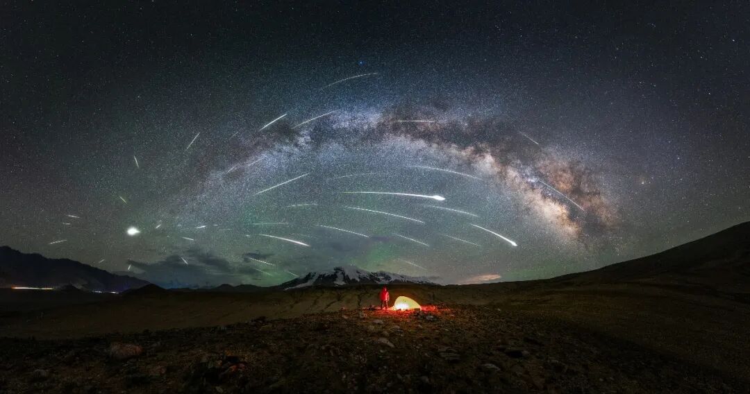 英仙座流星雨极大值前夕,重装徒步踏上慕士塔格峰山脚的高原。入夜,来自雪山的大风不断吹动着我的帐篷,也吹起了我仰望星空的热情。就在这个夜晚,我看着一颗颗流星划过慕士塔格峰,在这“冰川之父”之上留下痕迹。