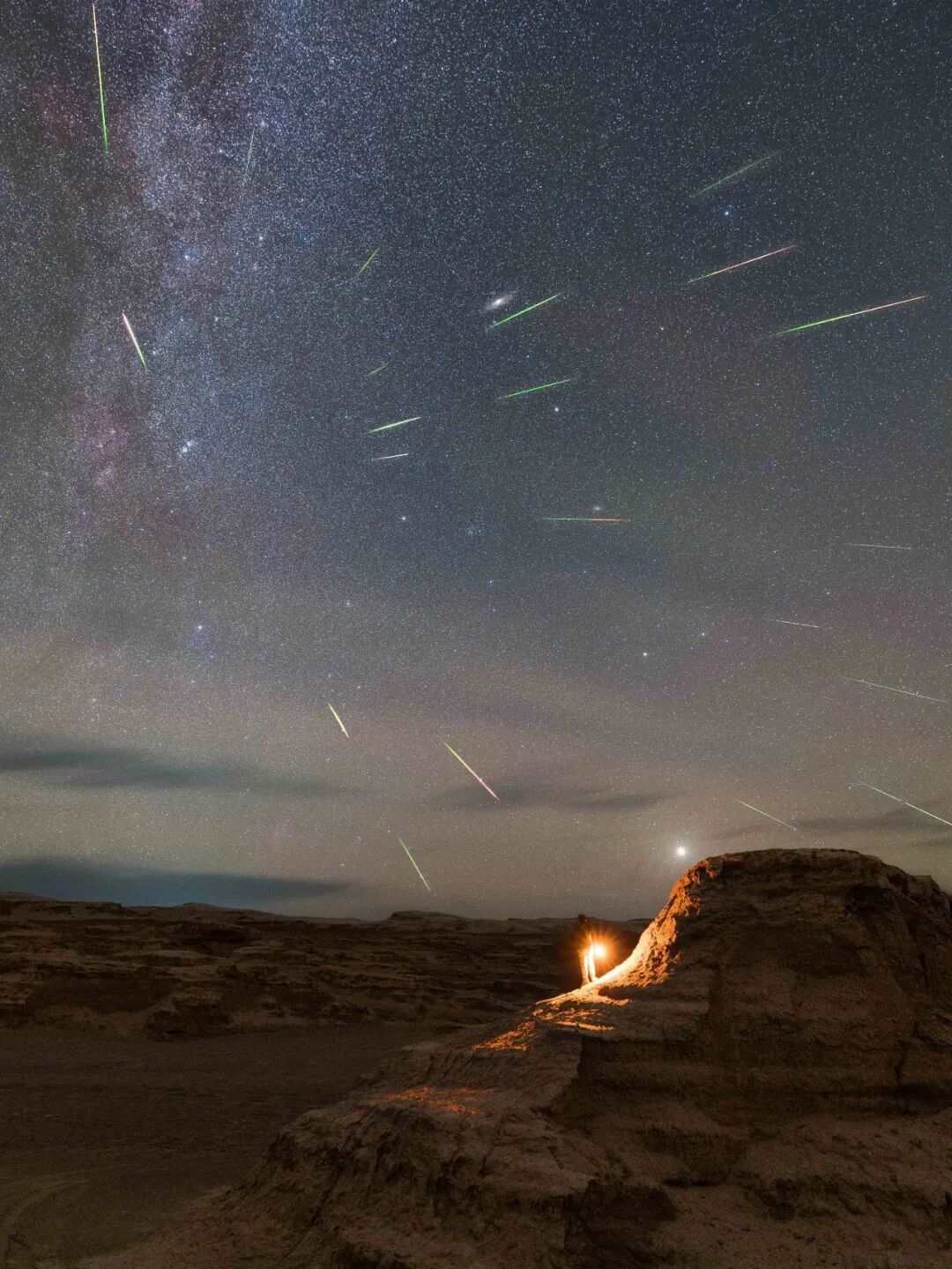 第一次现场感受流星雨,看它从辐射点出发,从头顶,从身侧,从银心两边不断划过。我想记录下此刻的感受,8月垂直的银河,从身后连接到眼前,头顶的夏季大三角与不断划过的流星,诉说着宇宙的奥秘,又有多少个愿望在今晚被许下呢?