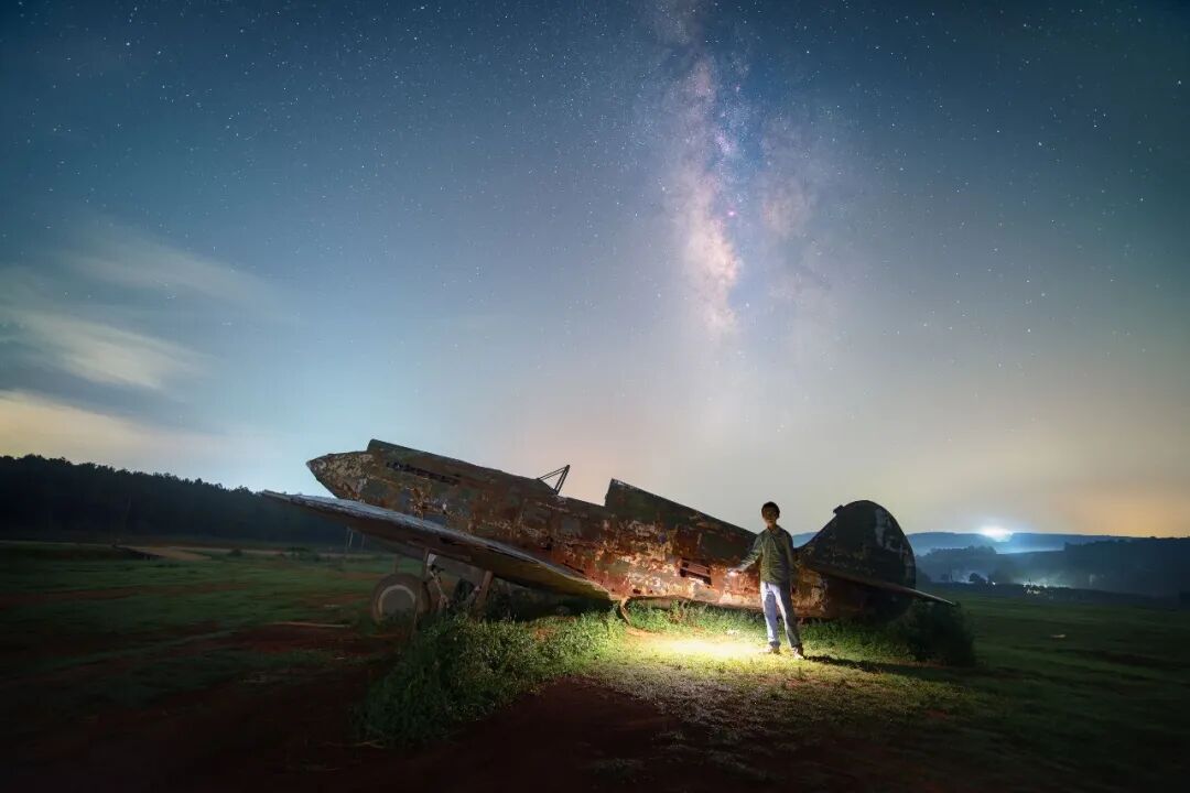 寻甸北大营草场,距离昆明主城区93公里,这里是典型的高原草甸生态,也是电影《无问西东》的拍摄地,当年的拍摄道具——飞虎队飞机仍旧停在那个地方,经过风吹日晒,变得有些破旧。随着城市的建设,这里的光污染也变得越来越强。银河已不如之前明显,我本是为了拍摄英仙座流星雨而来这里,但是运气不好,只看到两颗却没有拍到。在星空之下,我的苦恼被那些古老的星光扫除,我想到了电影里的那些台词: