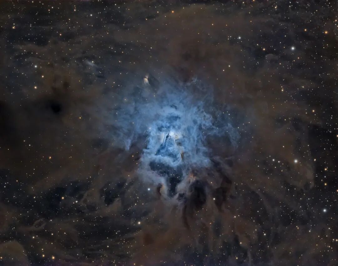 鸢尾花星云是一朵绽放于仙王座的宇宙花朵,距离地球1300光年。该星云中心迷人的蓝色结构跨度约6光年,为一颗炽热的蓝色恒星照射附近的宇宙尘埃所致。这副美丽的画面不禁让我们泛起联想,美丽的鸢尾花犹如一只宇宙之眼,透过冲冲迷雾窥视地球。