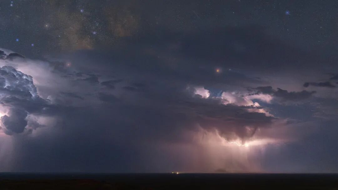 在追寻英仙座流星雨途中,遇到了雷暴天气,于是疯狂地追赶着雷暴与银河同框。
