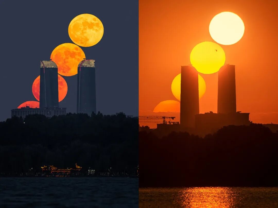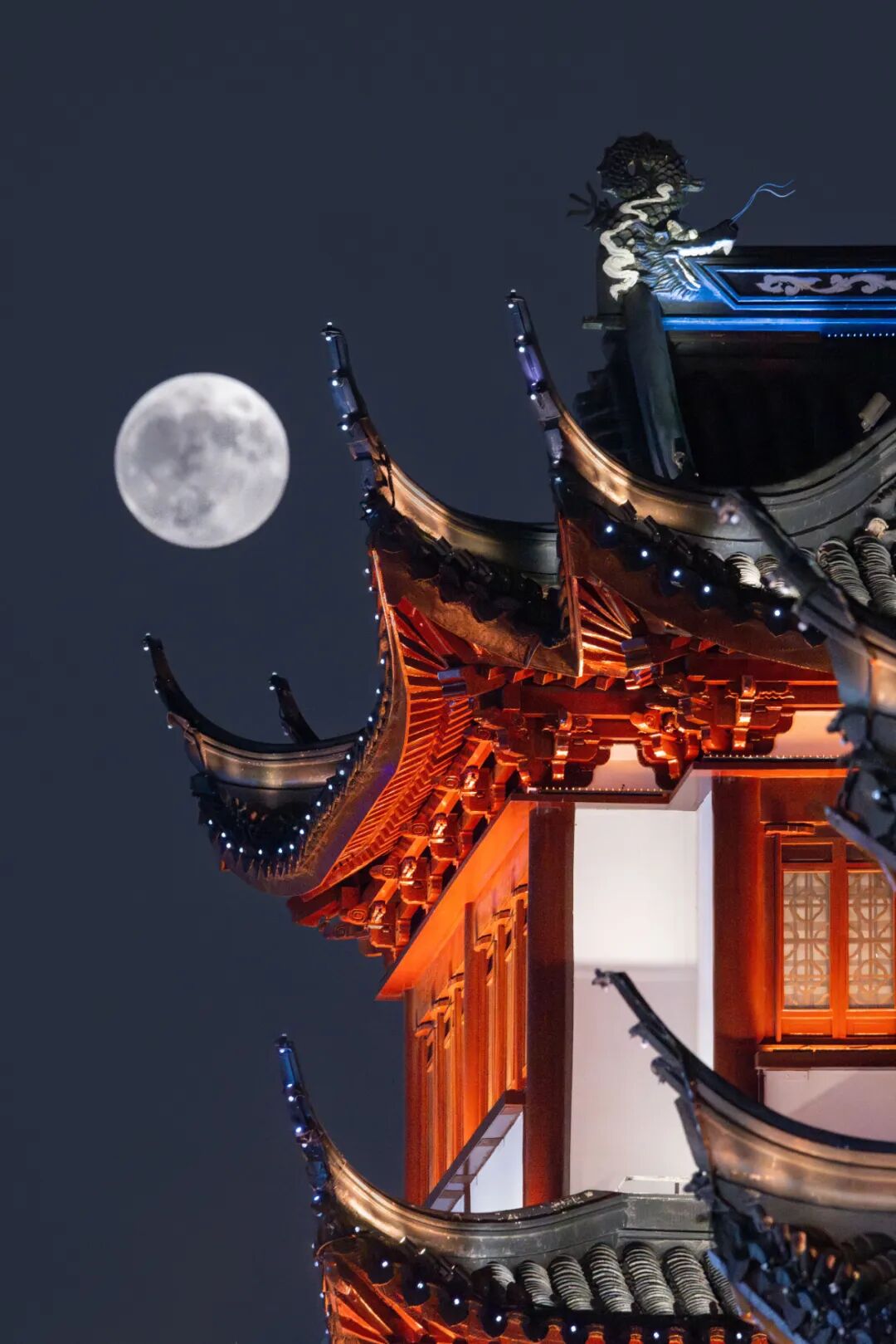日落时分,盈月初上。在前景穿北亭的映衬下,更添一番传统佳节气息。