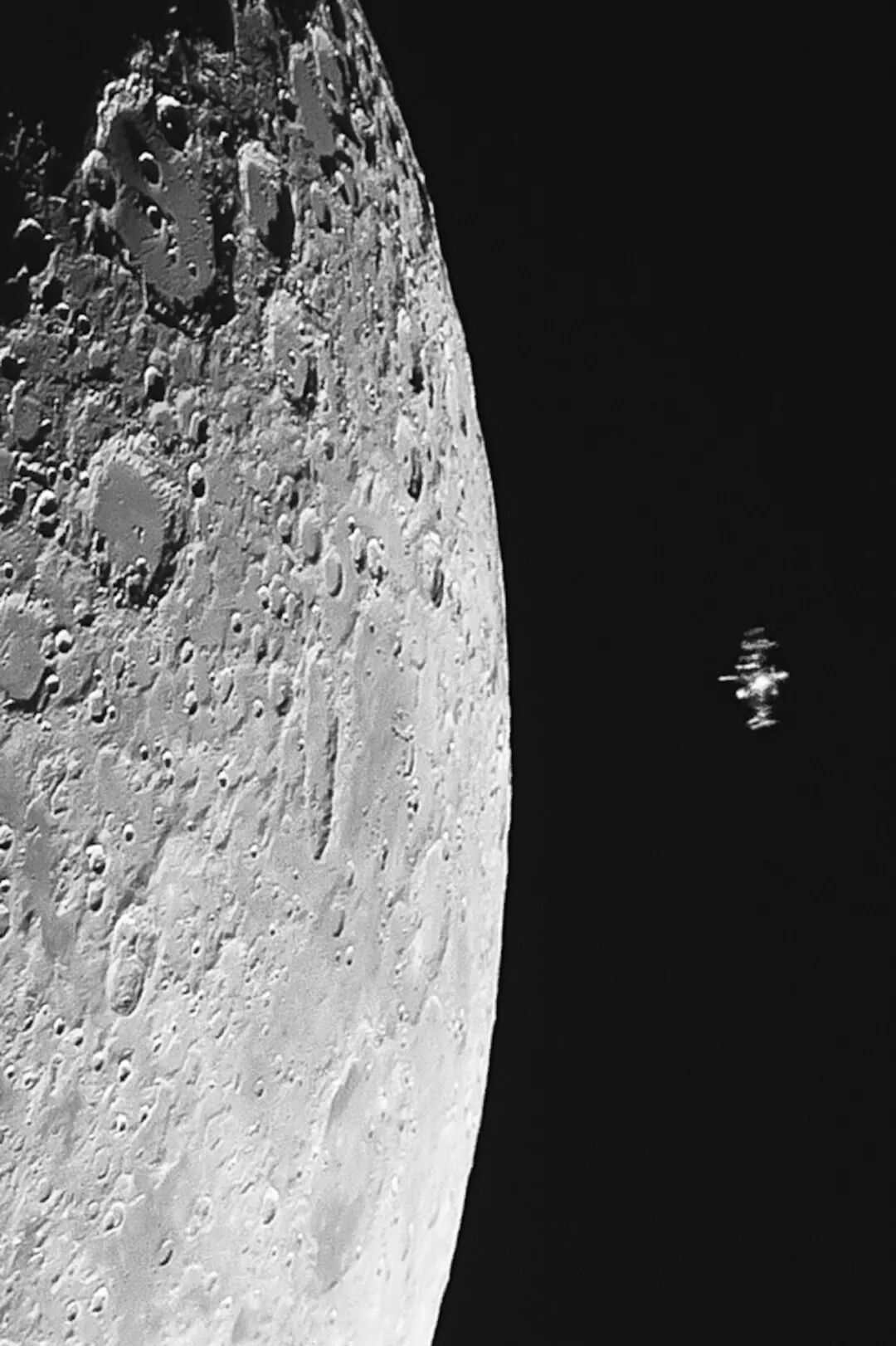 空间站看起来离月亮很近,实际很远。和好友早上两点出发,到达凌月点,时间来到04时47分35秒,国际空间站从距离我头顶约483千米飞过月亮,仅0.69秒,拍摄半秒钟,往返三小时。