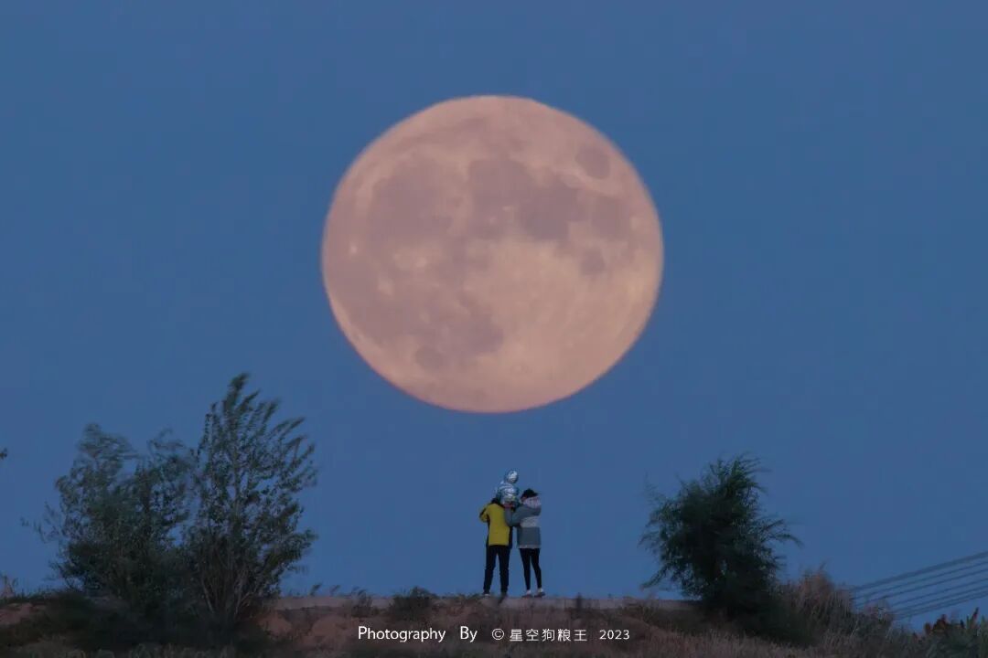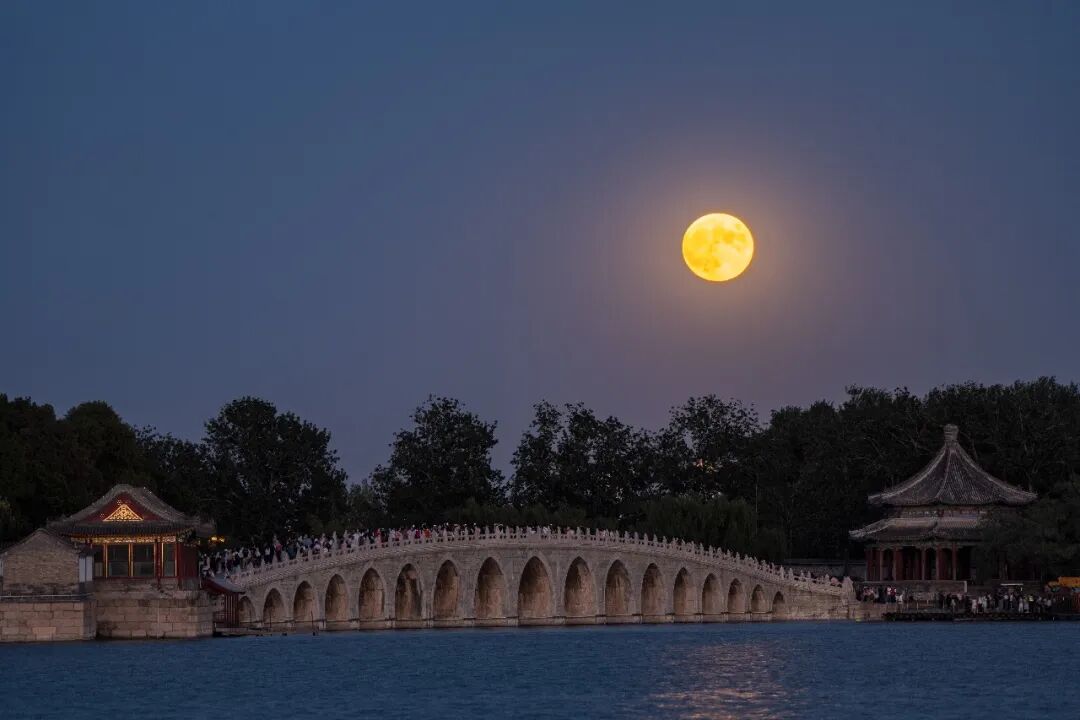 适逢中秋国庆双节,一轮满月从颐和园十七孔桥上方升起,宛如银盘。月亮散发出柔和的光辉,将皎洁的月色洒向湖面,与古建相得益彰。佳节遇佳景,桥上的行人纷纷驻足赏月,拍照留念。