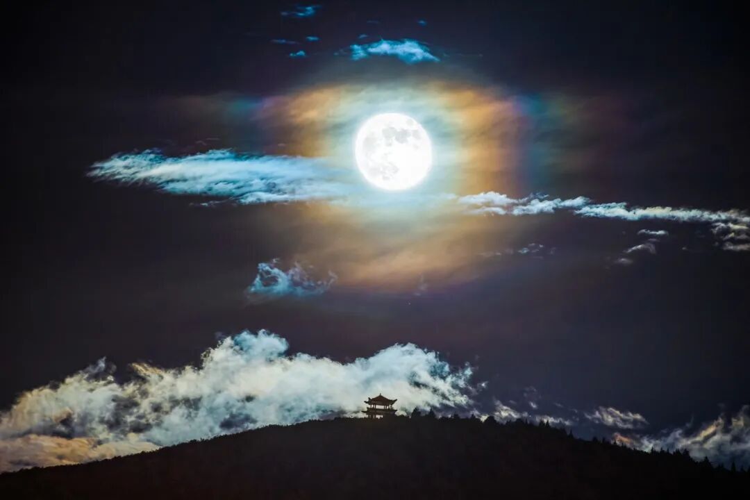 在丽江的雨季拍到合适的月亮真的很难!第一天拍摄都是云,第二天下雨!第三天终于在天黑后拍到了月亮,而且是彩云追月版。祥云和月光洒在象山顶上的亭子上.犹如天上宫阙。