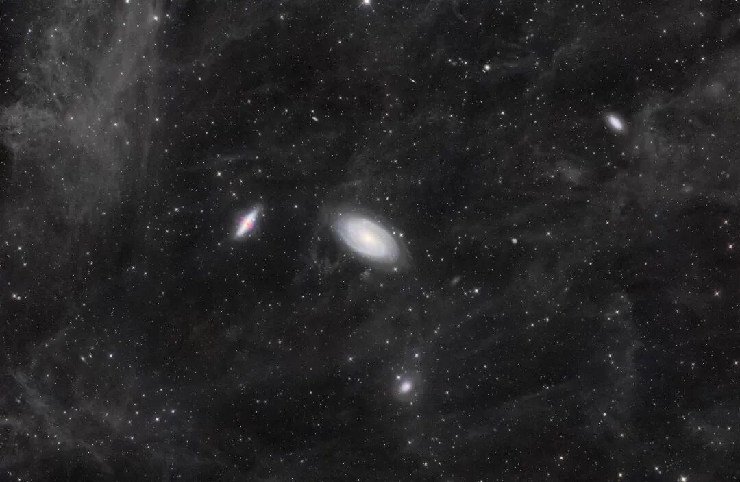 在20h的曝光下,我们可以清楚看到IFN的云气与细节。M81旋涡星系,地球天空中最明亮的星系之一,位于大熊星座北部的方向。它是距离地球最近的宏相漩涡星系。M82是一个不规则星系,位于大熊座,离我们1200万光年远,在望远镜中很容易看到它。