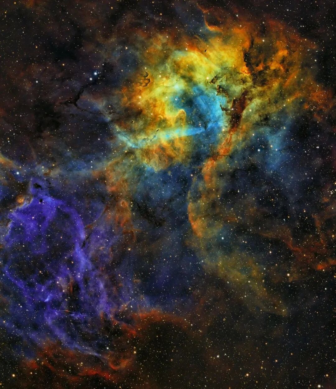 SH2-132,或称狮子星云,位于仙王座南部,距离我们约10,000光年,面积约40角分,属于丰富的HII区域,含有星团、发射星云和暗尘区。