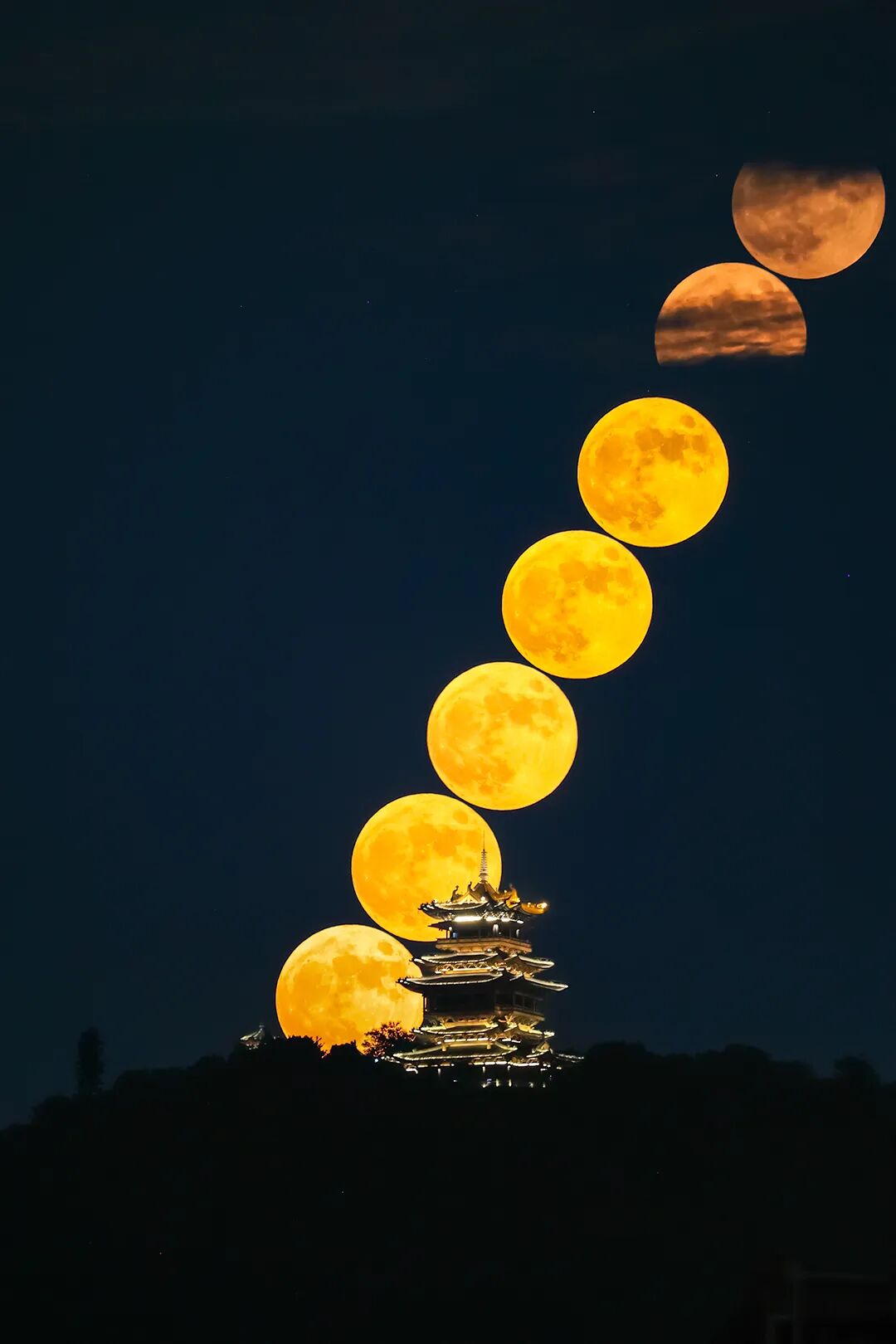 中秋节傍晚杭州的天气预报是有雨但无云,没遇到过这样的天气,那就带伞出发吧。快到月出山头时,天色已经比较暗了,辨不出是天黑了还是乌云太厚,突然一轮明月就升起来了。延时拍摄已经开始,心里好像也响起了音乐声。拍摄快结束时,雨点也大了起来。