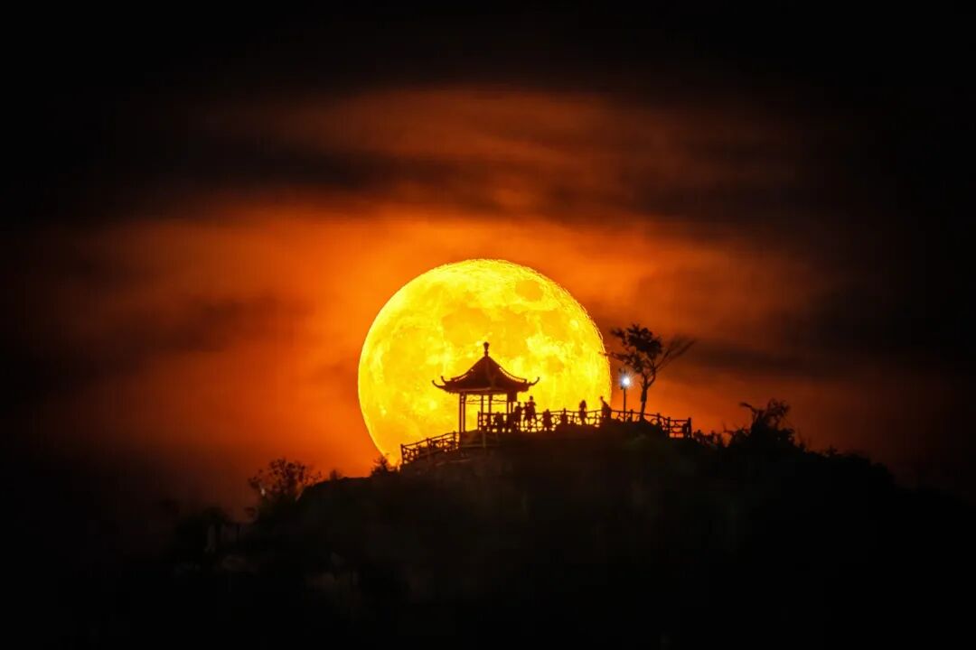 2023年9月30日晚,在邕江北岸的游人瞩目下,一轮圆月从青秀山龙象塔缓缓升起。