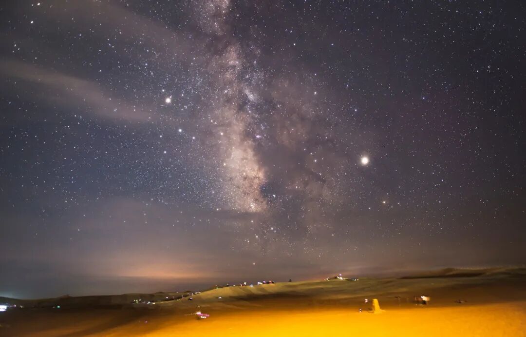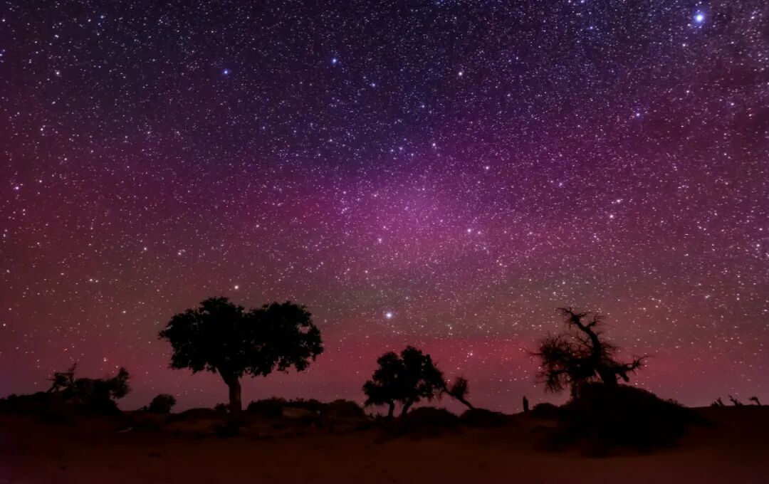 “生而不死一千年,死而不倒一千年,倒而不朽一千年”,千年胡杨被称之为植物中的“活化石”,亘古星空下胡杨愈显沧桑。夜空中同时弥漫着绿色的、暗红色的、紫色的气辉,这是由距离地面几十公里到一百五十公里左右的高层大气化学发光现象产生。