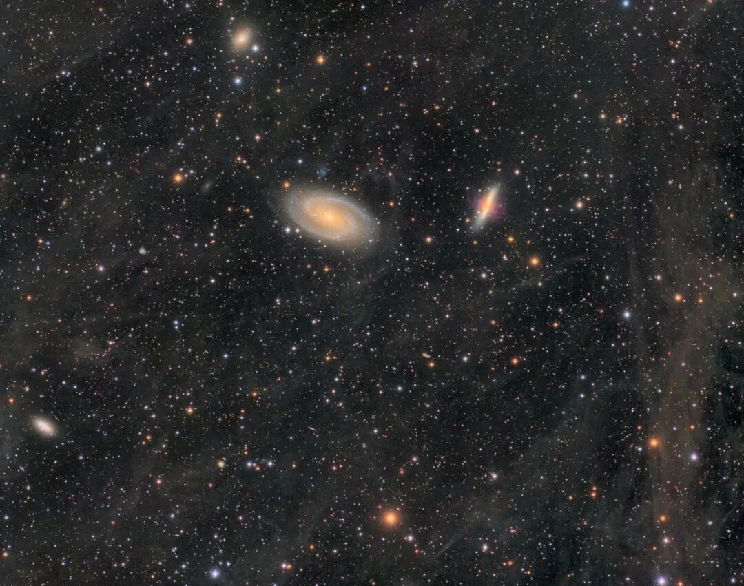 位于大熊座有一个著名的旋涡星系M81,它是非本星系团中离我们最近的星系,而在它北边大约2度的地方,还有一个星系M82,它隔着一片尘云侧面对着我们。在这两个星系中,爆发了一场引力战争,无论怎样,10亿年后只有一个星系能存活下来。