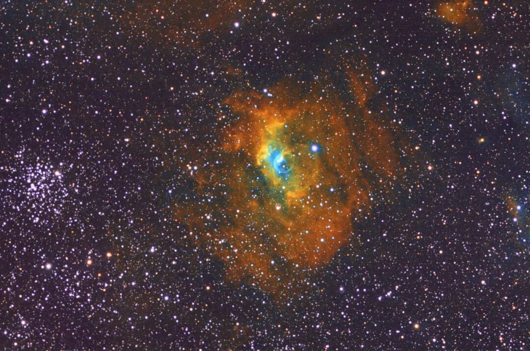 气泡星云,正被在它中心大质量恒星BD+602522的恒星风向外推挤着,气泡星附近有一块巨大的分子云,一直从它的顶上延伸到右下。气泡星云的直径大小约十光年,是气壳与恒星所组成的大型结构中的一部分。气泡星云位于仙后座方向,用小型望远镜就可以观测到。