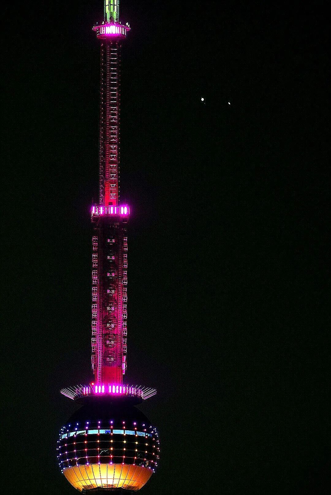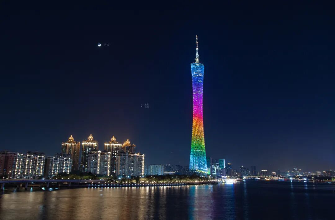 几十年一遇的“土木相和”来临,土星与木星越来越挨近,趁着月亮正当距离土星与木星不远,拍下夜空三星与广州地标广州塔的合影。