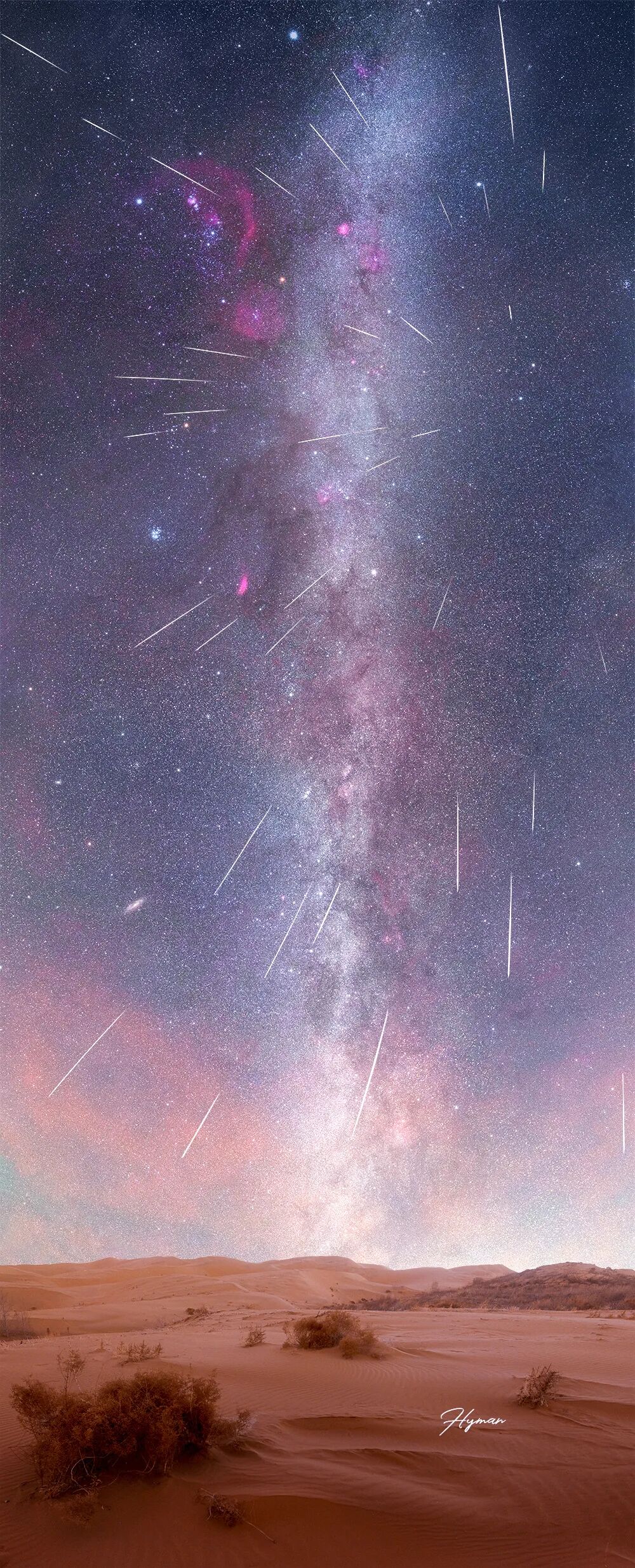 参数 / 背景:14mm,F1.8,ISO 6400,星空赤道仪曝光1分钟,地景关闭赤道仪,共38张拼接;流星:6机位,选用36张流星照片对齐星点叠加