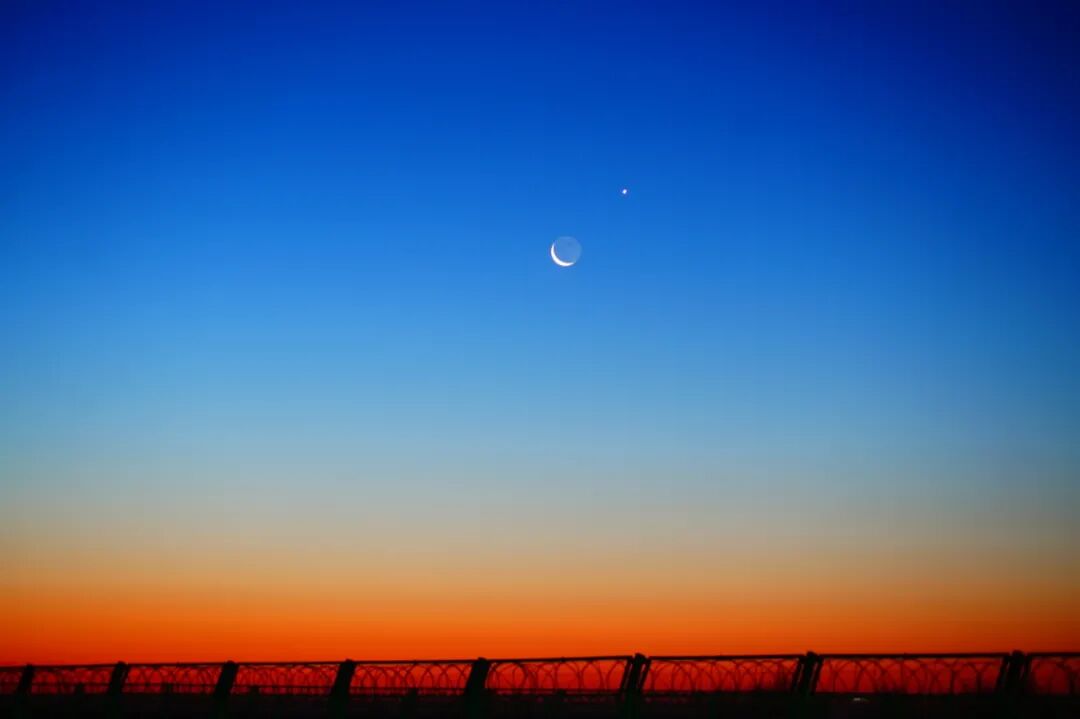 执勤时看着月亮慢慢升起,又看着金星从月亮中钻出来,六点下岗赶紧拿相机拍了下来。