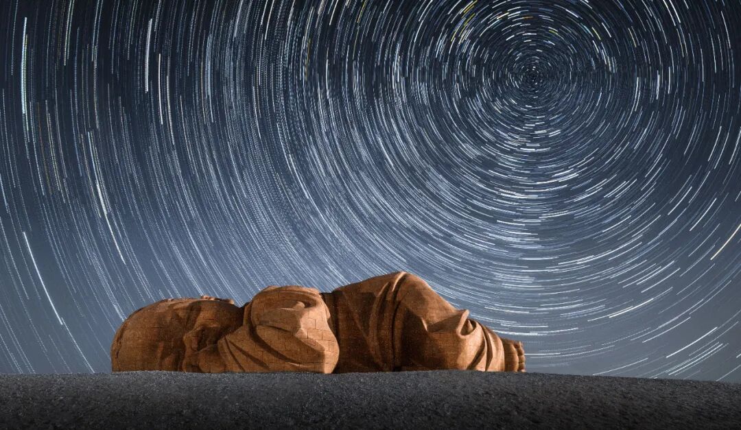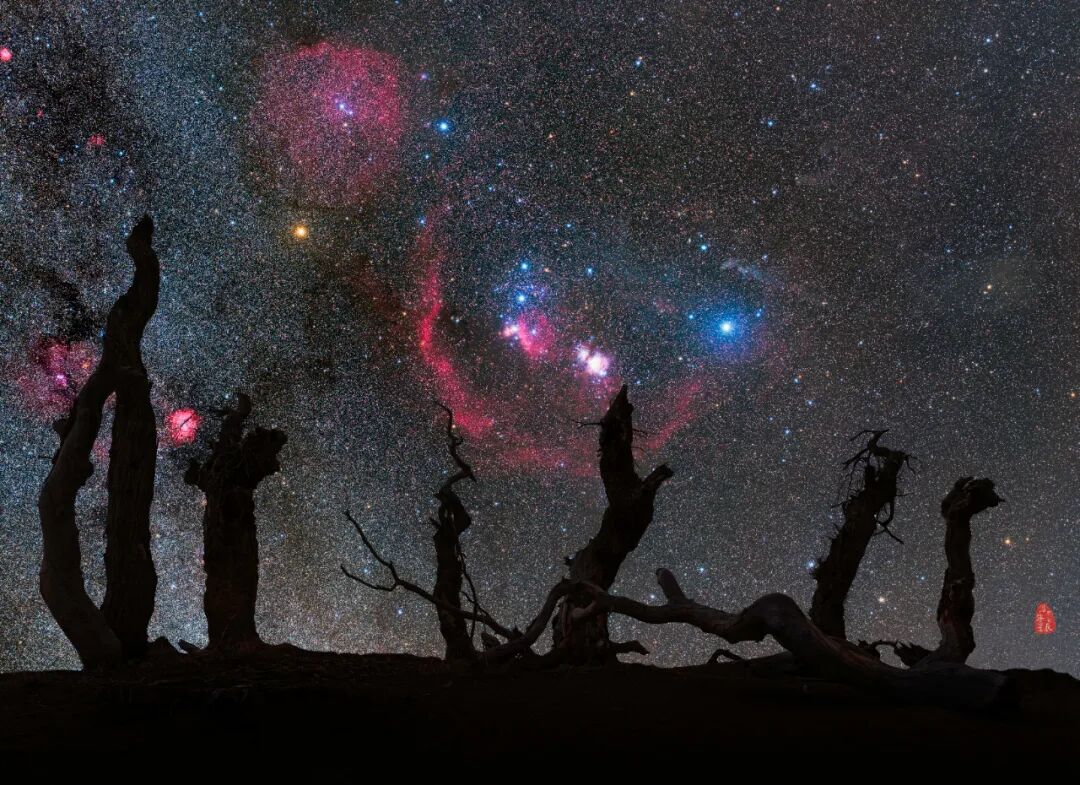 千年胡杨,身虽死而魂犹在,那种不屈与倔强,犹如大地精灵在戈壁之上翩翩起舞,与空中形如凤凰的猎户座大星云交相呼应。