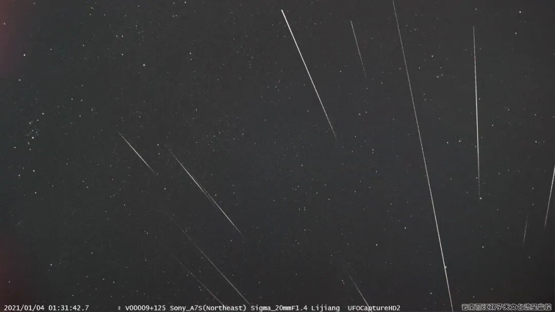 2021年象限仪流星雨如期而至,但今年极大值的时间提早了,当地时间还未天黑,因此晚上抓捕到的群内流星数量并不多。我选取了一些长的流星进行叠加处理,由于辐射点不高,流星看上去都是从下往上飞的。