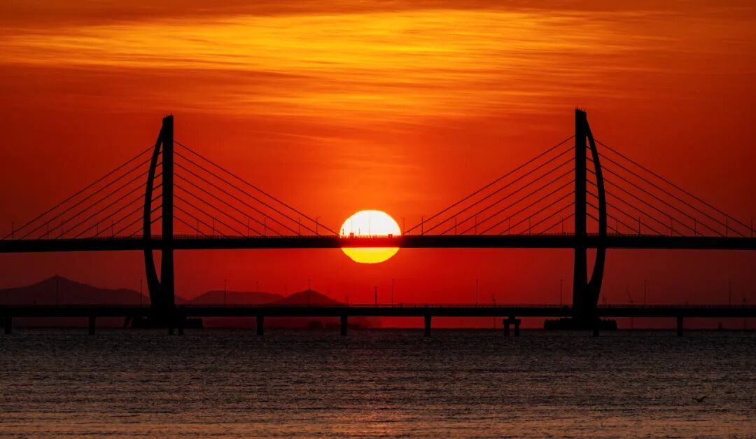 通过前期的科学规划,让2021红日从珠海市区30km外的桂山岛风车后升起,同时刚好穿过港珠澳大桥九洲航道桥中间时,太阳像是长了两颗可爱的小眼睛。:)