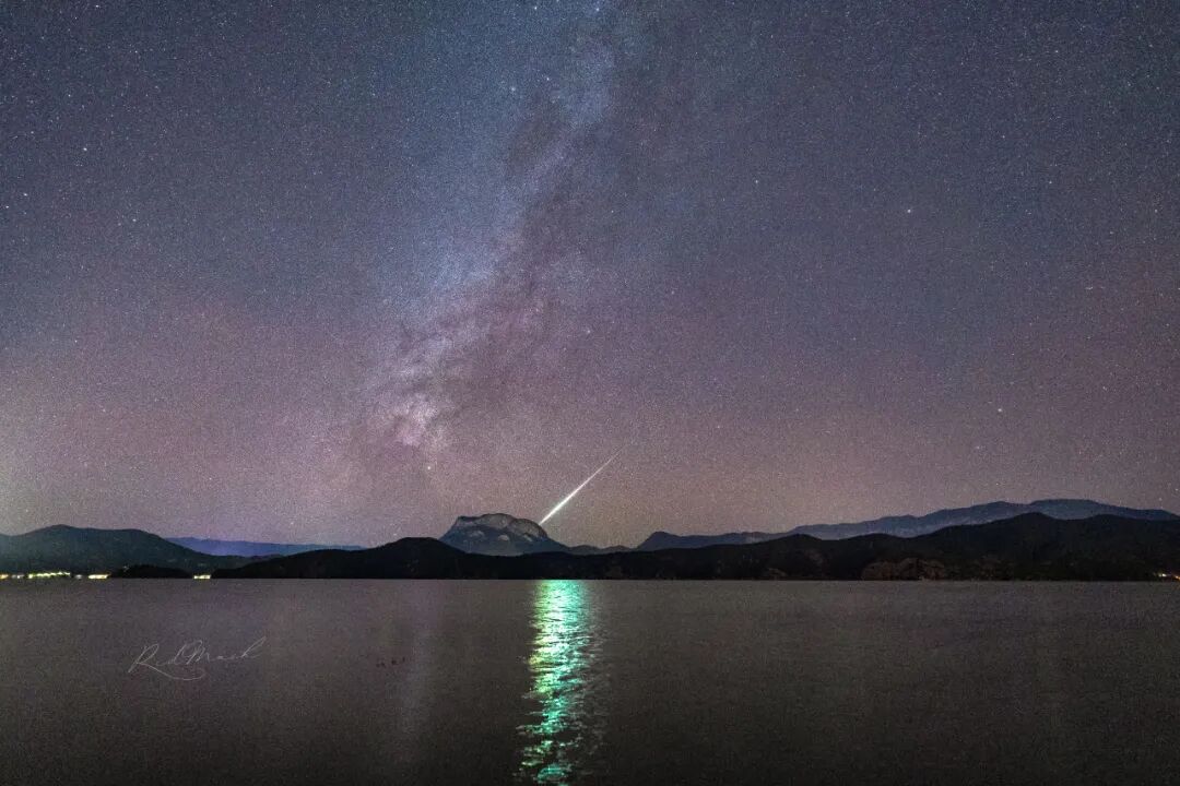 泸沽湖边一颗非常亮的火流星划过女神山之巅。