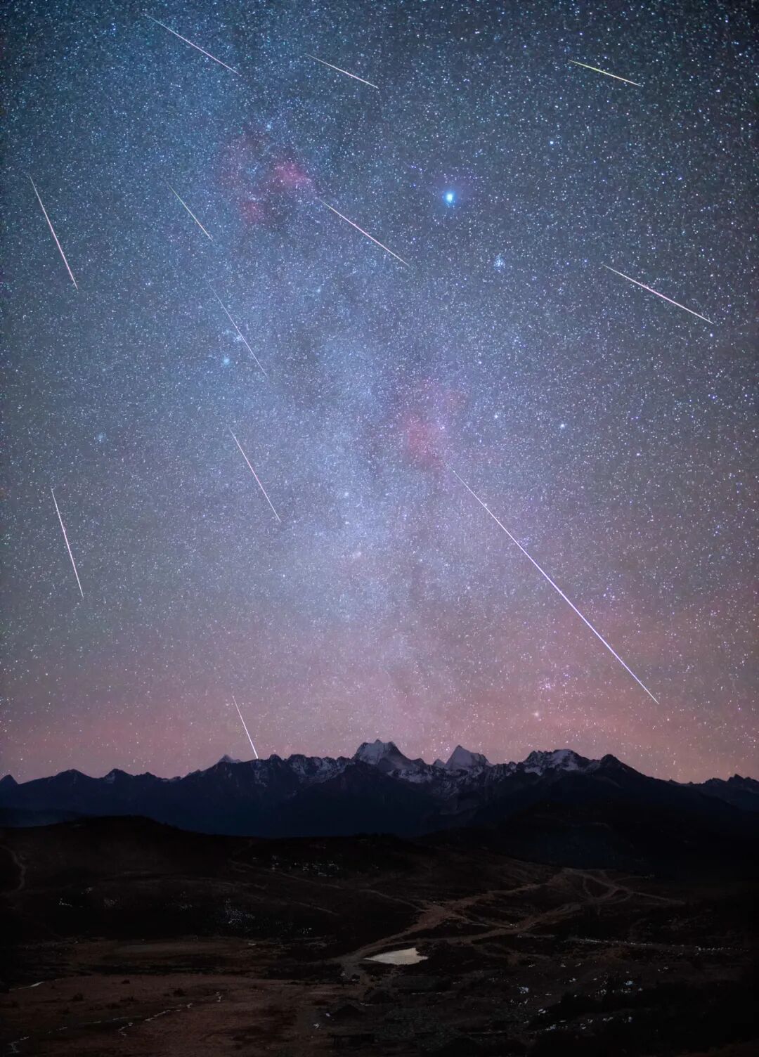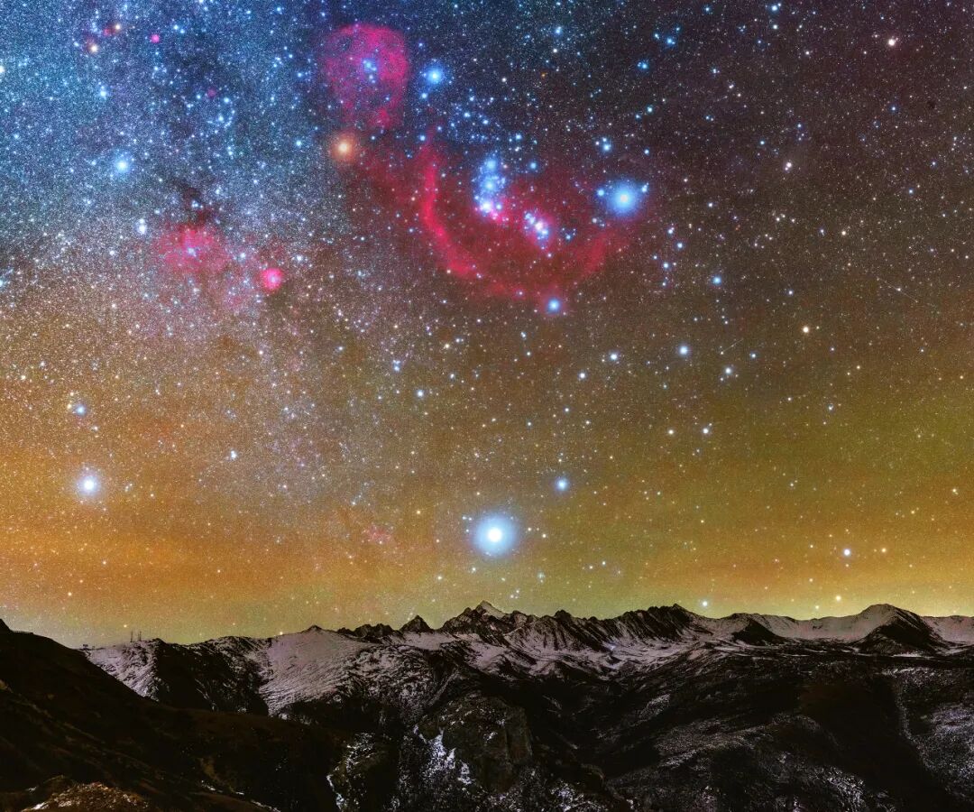 冬季最为明亮的猎户座从岷山之巅的雪宝顶缓缓升起,在天文改机的拍摄下,猎户座的巴纳德环在雪山上空显得格外绚丽。
