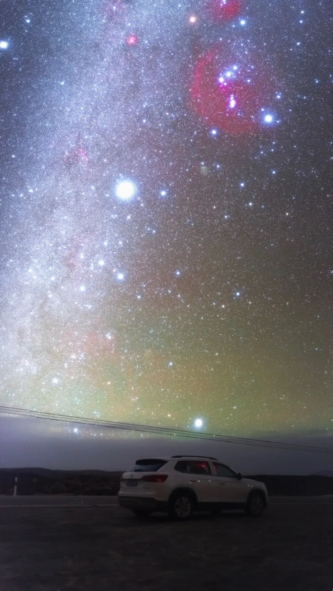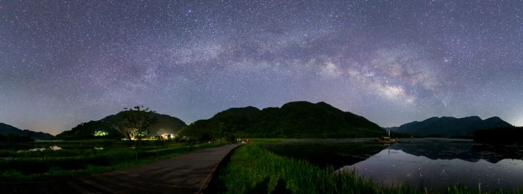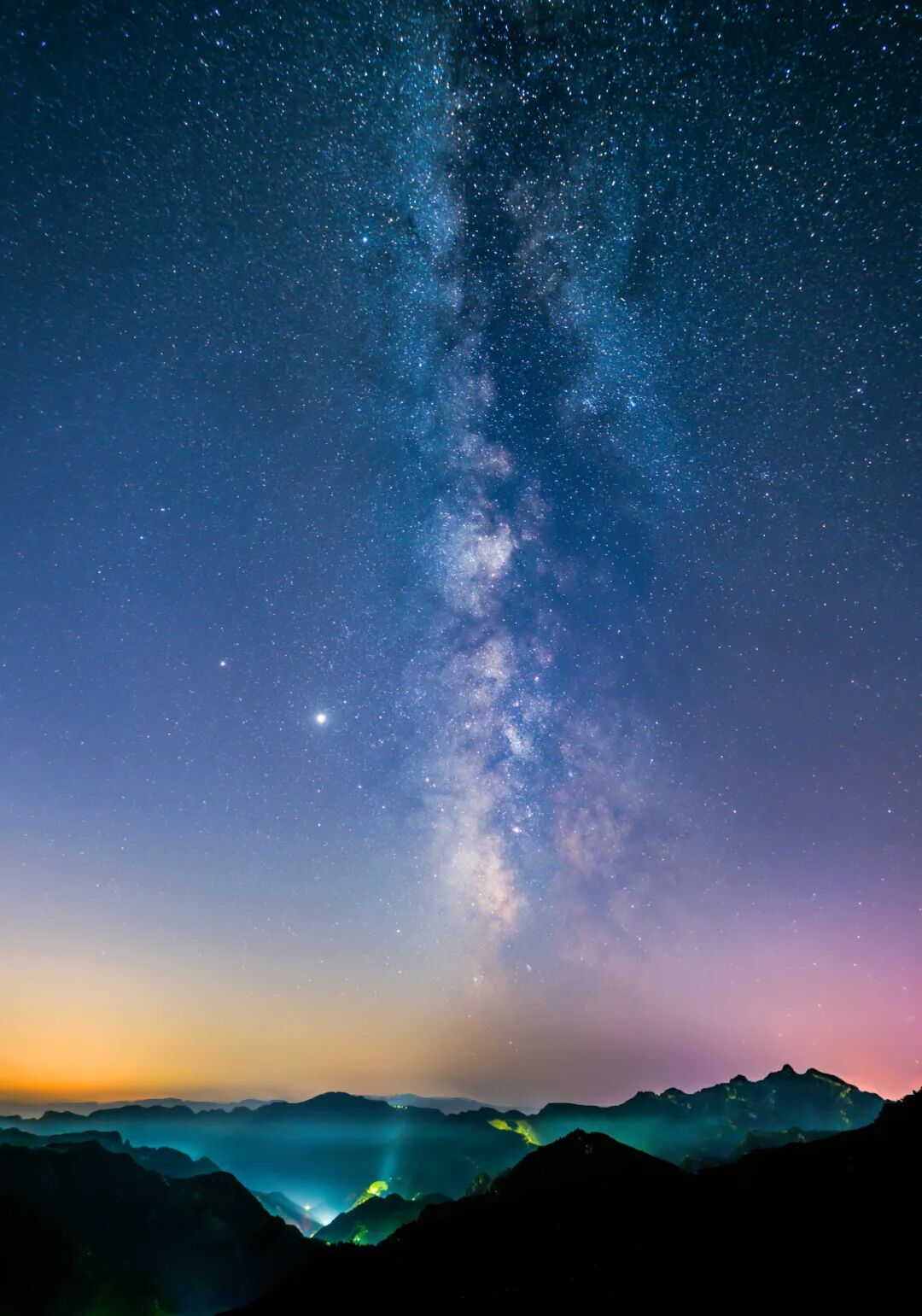 璀璨的银河从天顶垂直洒下,渐渐消隐于远方县城的灯光之后。那里,五彩斑斓的星光与灯光融为一体。