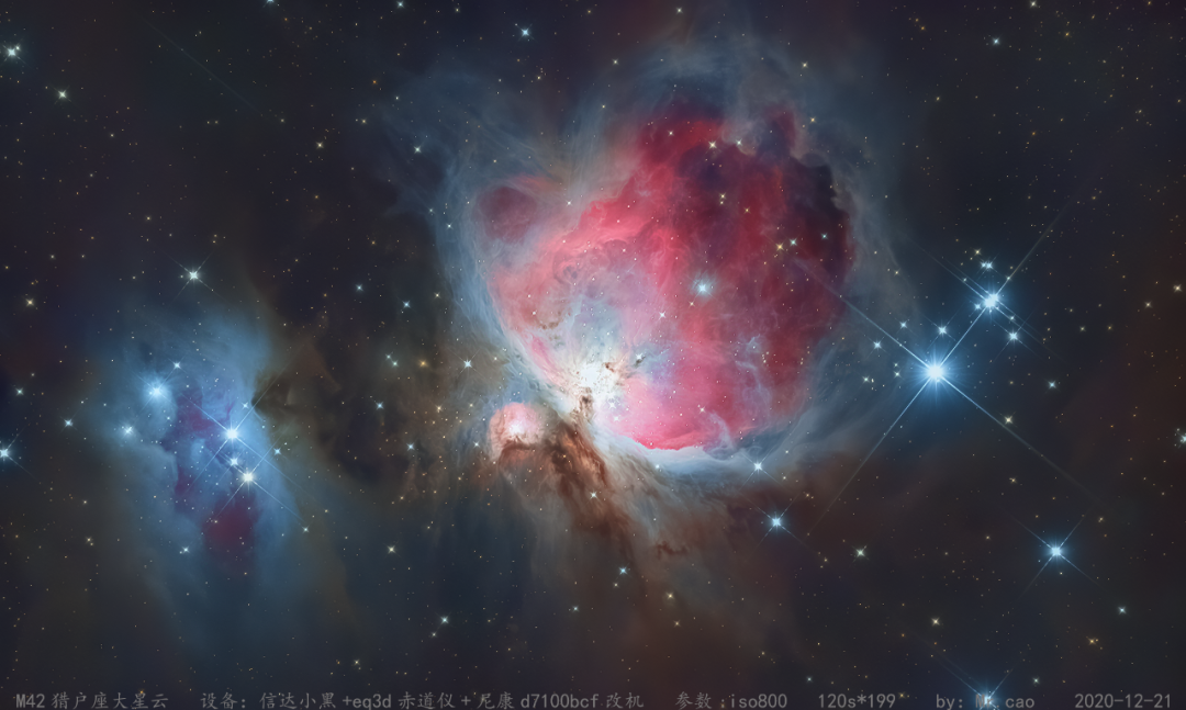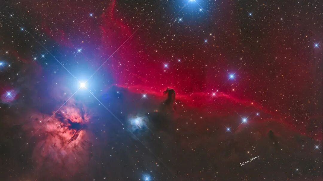 马头星云是猎户座分子云团的一部分,距地球约1500光年。其中黑暗的马头是由相对浓密的尘埃组成,高约1光年;其下面的亮星为正在形成的年青恒星,左侧亮瞎钛合金眼的就是参宿一,马头背后的红光则来自被参宿一游离的氢;左下角则是美丽的火树星云。由于视场不够大,所以整张照片由两张不同角度的照片拼接而成,它们共同由42张单张曝光5分钟的不同通道的照片合成。
