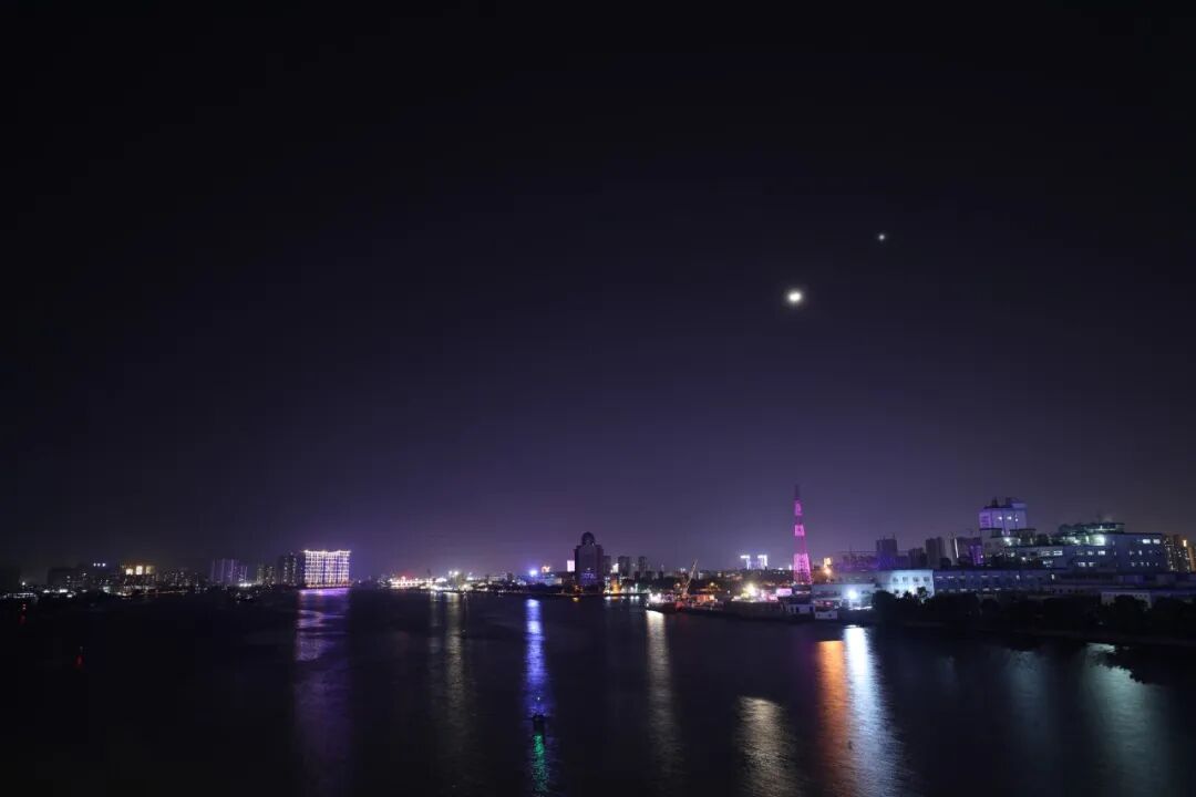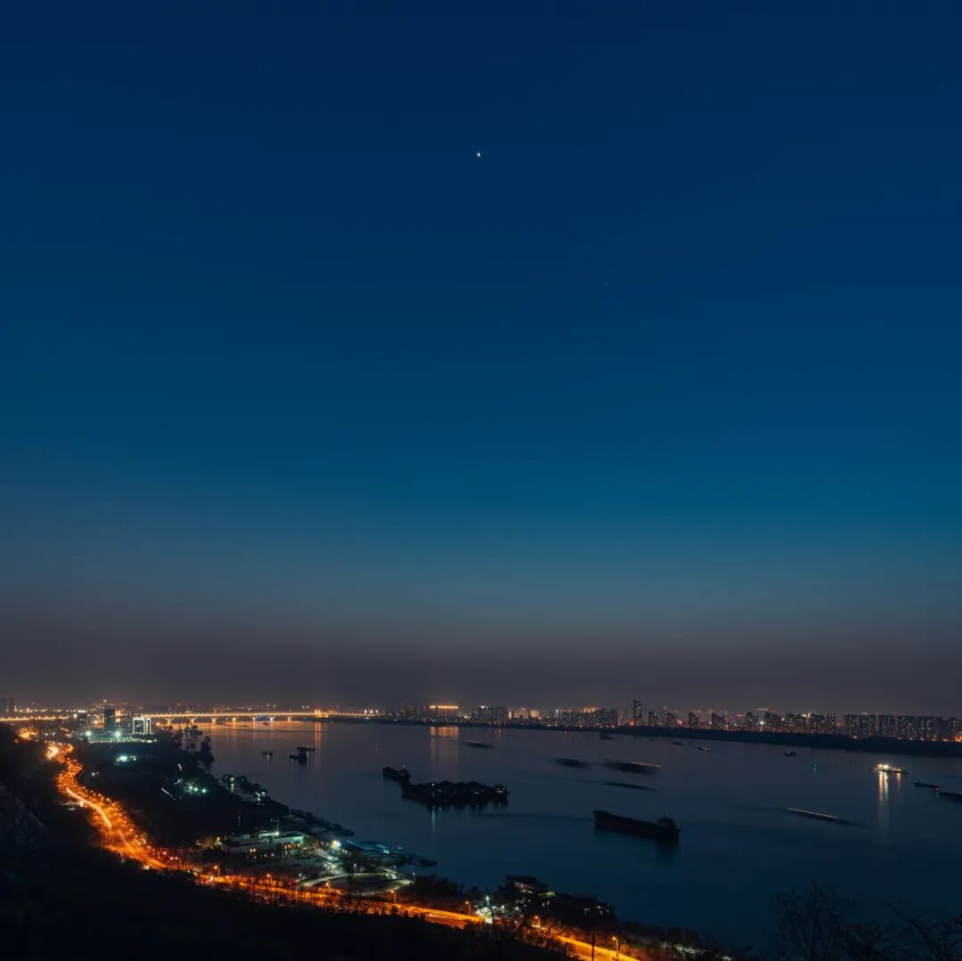 金星位于近日点。登长江畔幕府山,脚下是滚滚长江,远处是南京长江大桥,头顶是明亮的金星。