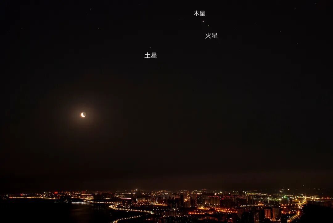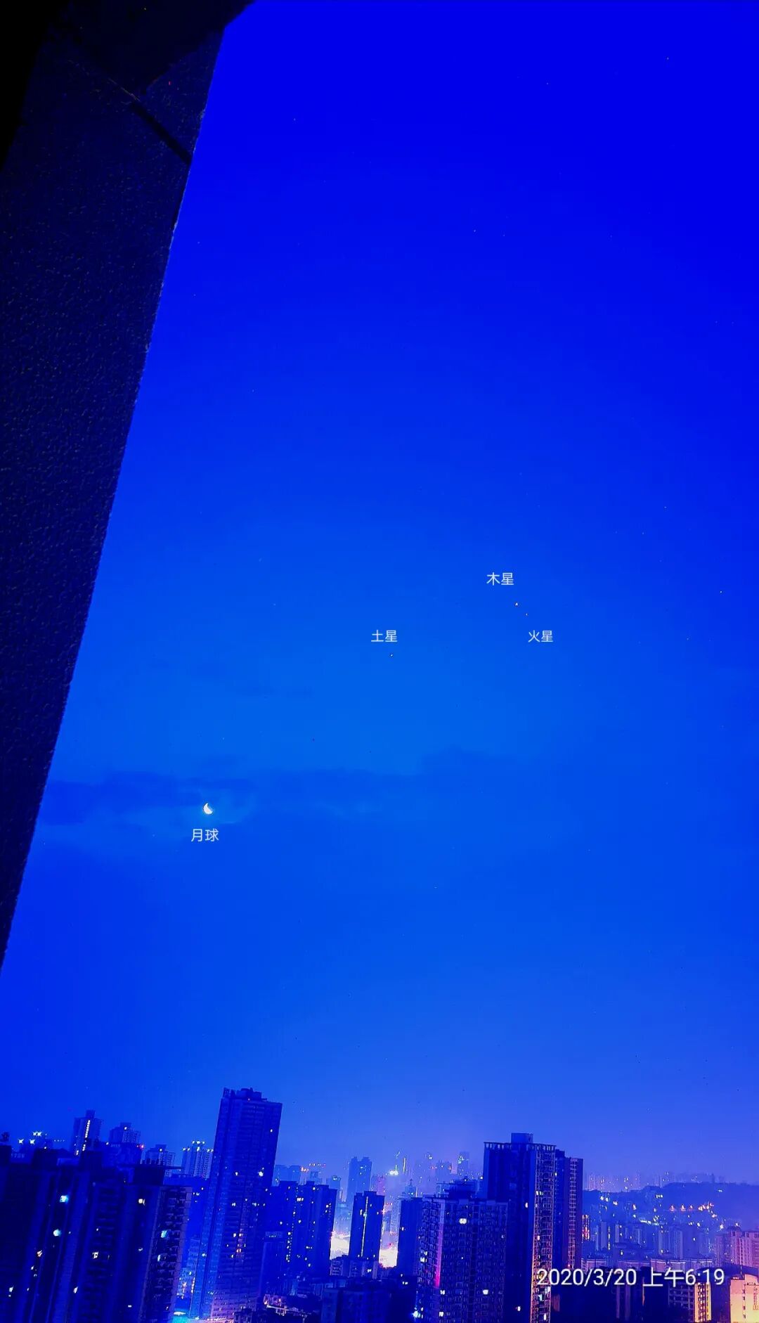 为了拍日出延时来到山顶,意外发现三大行星正与弯弯的月牙排排坐,就用备用相机拍了下来。