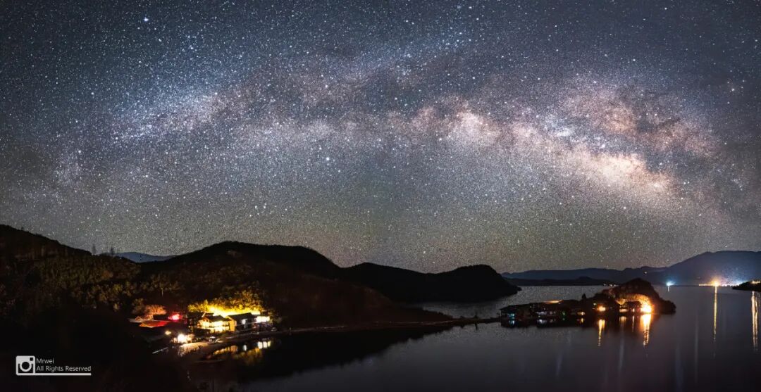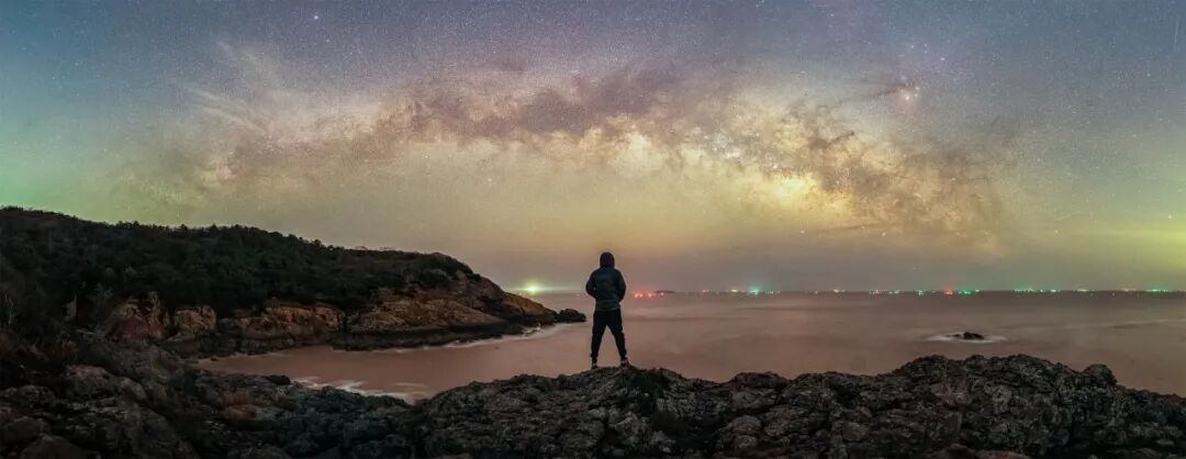 正月初七凌晨,天蝎座伴着数月未见的夏季银河缓缓升起。海风吹起层层波浪,远处渔灯微光点点,也好像洒落在海面的繁星。