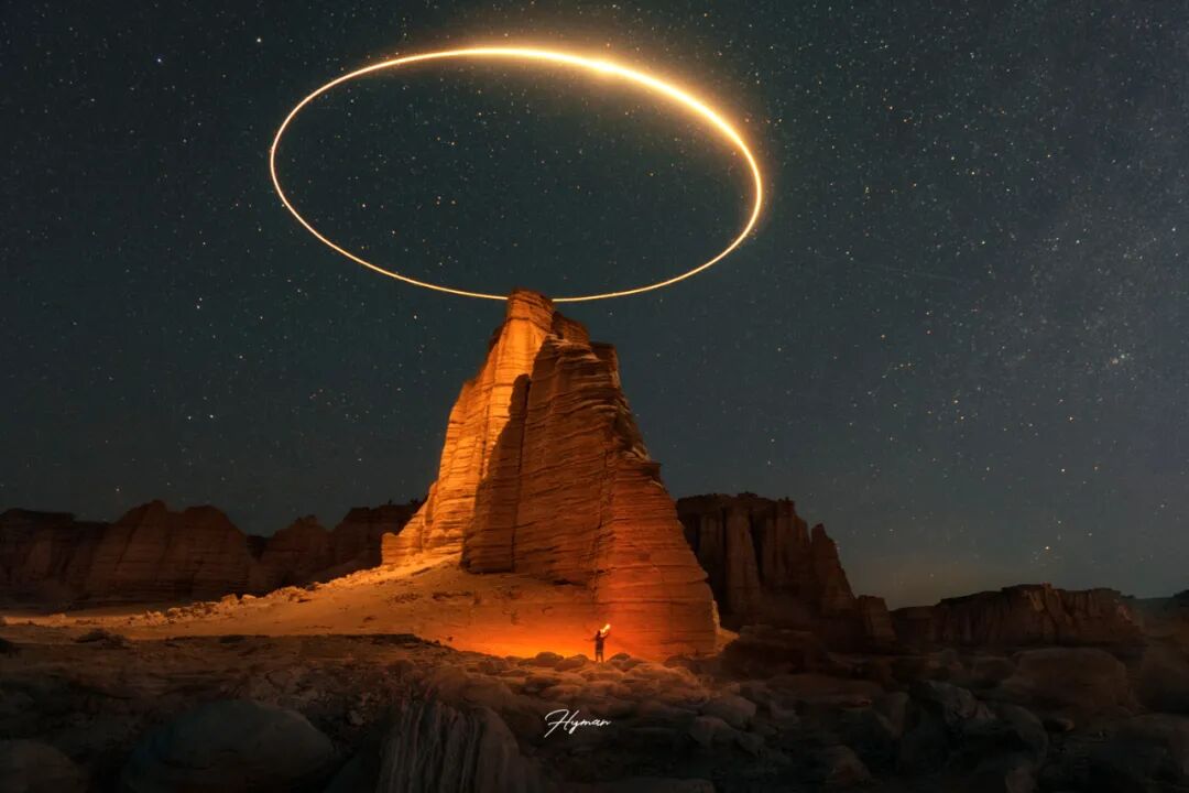大海道地处罗布泊边缘,是古丝绸之路的一个重要部分,自敦煌经哈密至吐鲁番长约500公里。无论是罗布泊还是大海道,名字中就可以看出,这里曾经是一片辽阔的水域,事实上罗布泊曾经是我国第二大内陆湖,大海道的干涸也是发生在上世纪70年代。照片中的这个地方,我管他叫蛋蛋石,是因为地面上遍布着大大小小的椭圆形石块,这显然是以流水侵蚀为主形成的雅丹地貌,很符合大海道的名字与气质。此处,高耸的雅丹地处正北,在北极星的指引下,我升起飞行器,在雅丹上方定格了一枚光戒,这大约是大海道的第一张飞行器光绘图,以示留念。