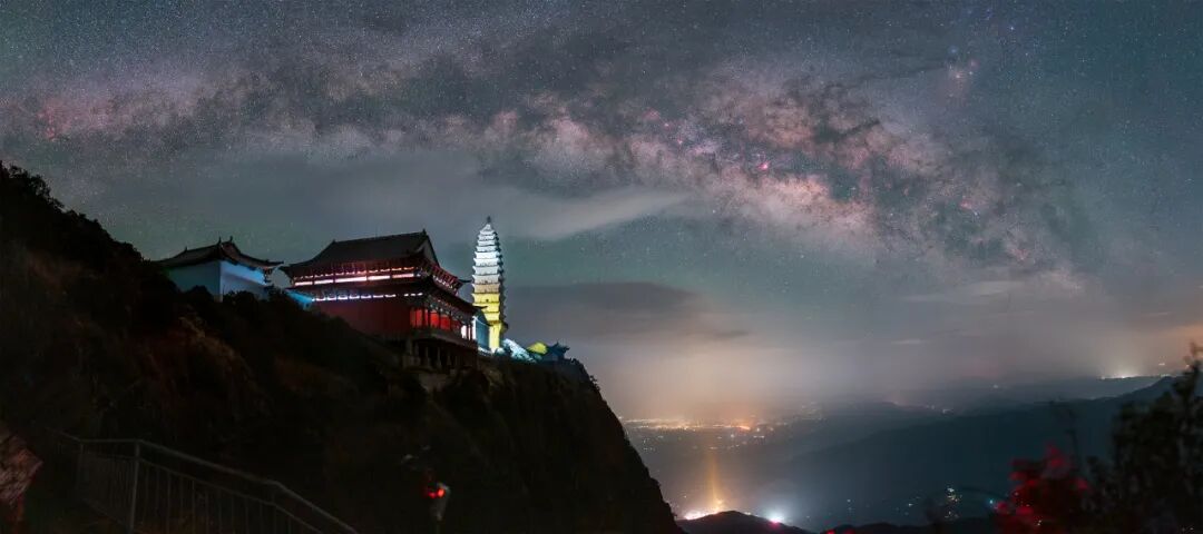 鸡足山雄踞滇西北宾川县内,是著名的佛教圣山,山顶有金顶寺和楞严塔,是方圆数百里的著名地标。夏夜,银河从塔顶升起,金顶寺内的灯光照亮了大殿和楞严塔,横跨在鸡足山上的银河拱桥以及壁峭悬崖、圣山古塔,显得格外庄重,十分震撼。要是山下宾川县的光污染再小一点就更完美了。