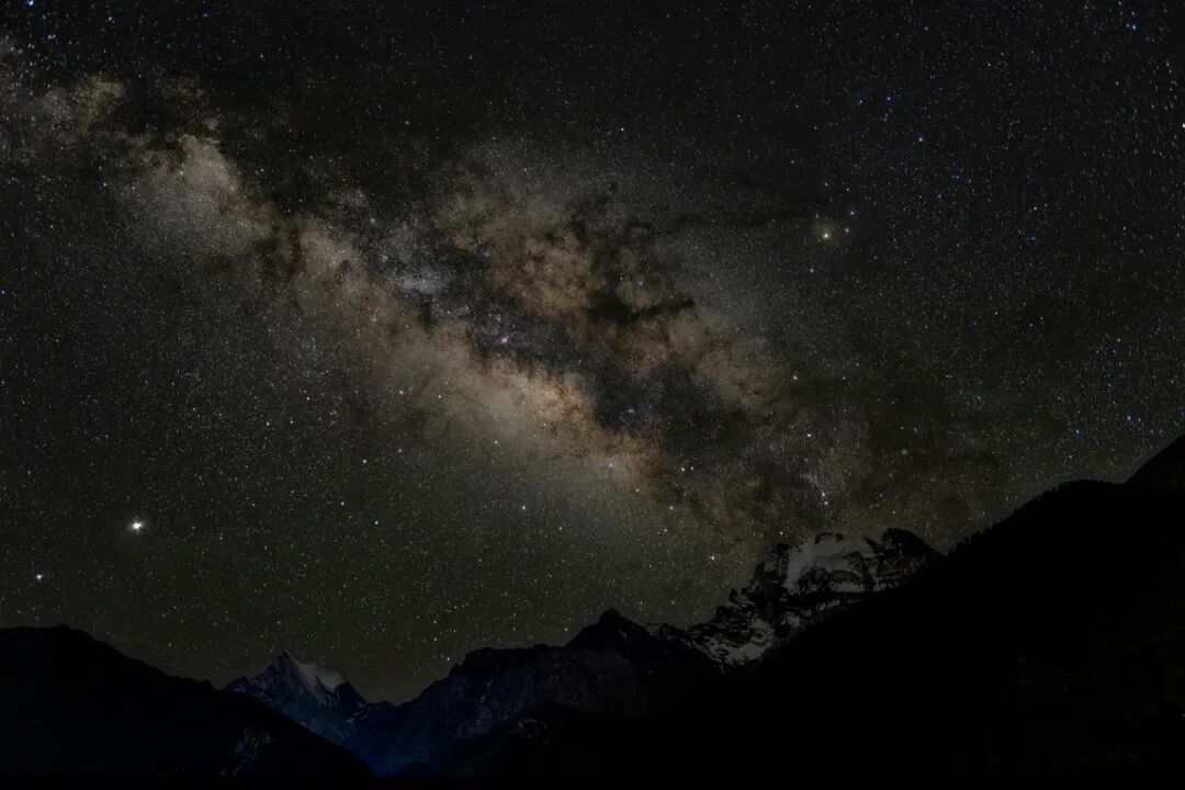 夏季银河从仙乃日上空徐徐升起,天蝎座的光微微照亮雪山,点缀着无限风光。