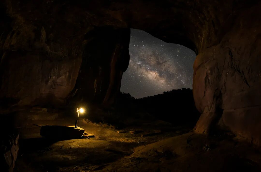 用全景展现这个山洞再合适不过了,洞口朝向正好是东南,银河渐渐从洞的一边爬出,我先花一会时间拍好了地景,又等银河升到正好的高度拍摄银河,最终展现出一个探险的人在黑暗的山洞里提着灯对着银河,似乎在与银河对话,满眼的星河又像是大自然对探险者的馈赠。