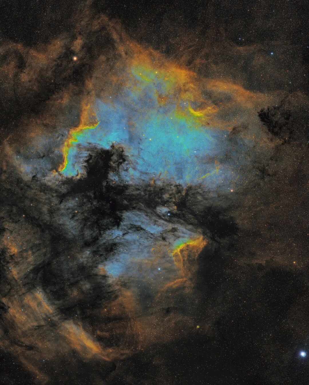 北美洲星云(NGC7000)和邻近的鹈鹕星云(IC 5070)实际上都只是同一个电离氢区构成的星际云的一部份,横亘在地球和这个复杂的星云之间的星际尘埃吸收掉了来自后方的恒星和星云的光,造成了我们所看见的形状。