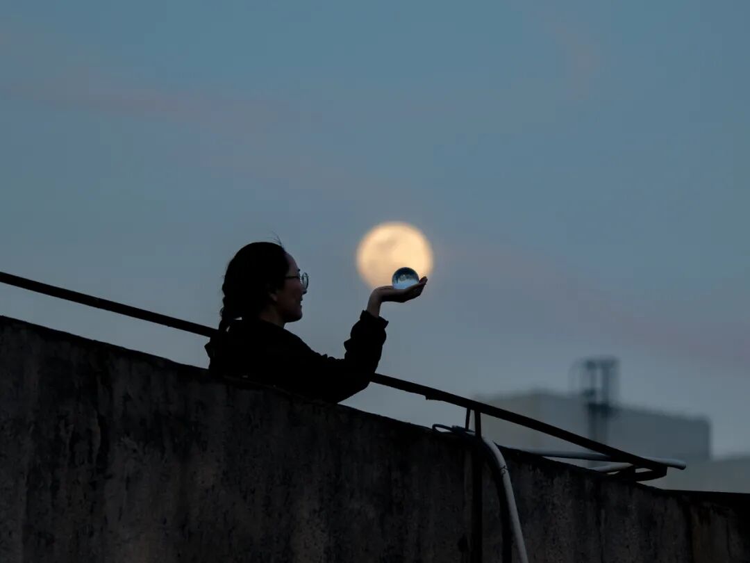 模特将今年第一个超级月亮捧在手心上。