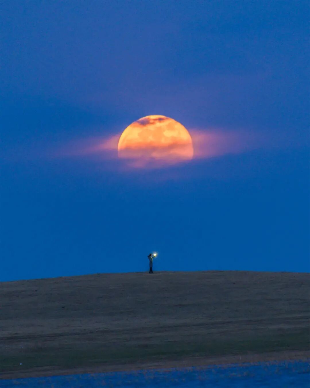 在黑龙江省大庆市连环湖,老法师喜迎2021超级月亮。由于地平线有云,当看到月亮的时候,已经超过预定高度。但恰好月亮跳出条状云的时候,外观看上去与土星环颇为相似,随手按动快门记录下此图。