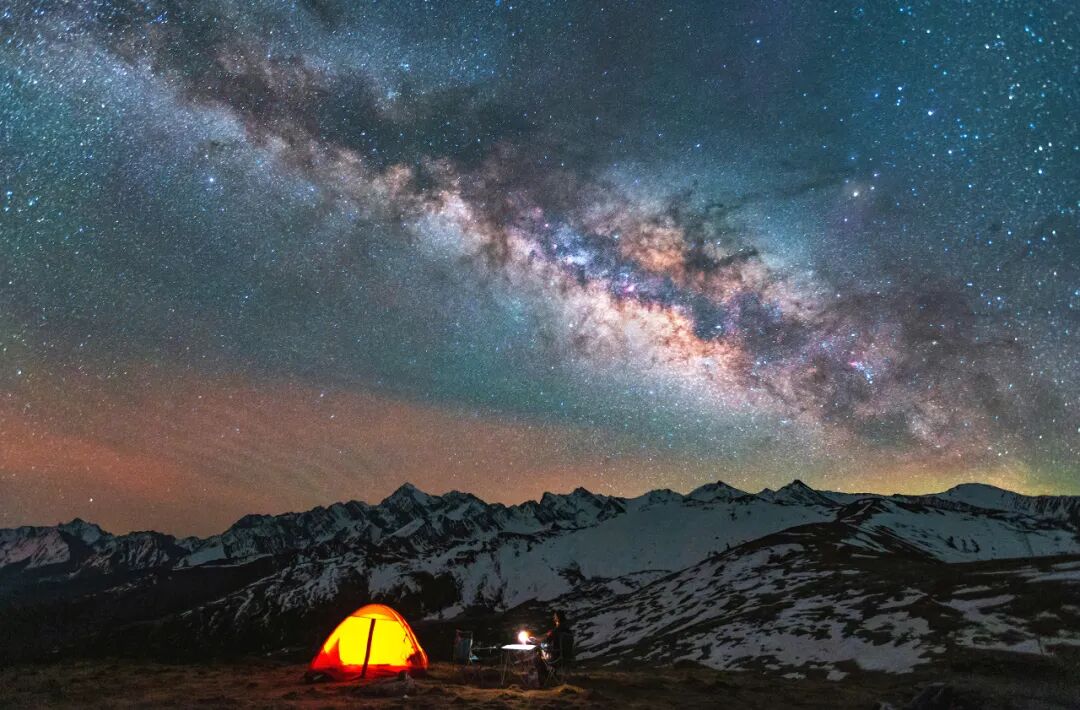 夏日的凌晨,银河从岷山主峰雪宝顶上空缓缓升起。在岷山之巅,搭上帐篷,摆上桌凳,亮一盏小灯,与天际的星空相伴,享受这静谧的时间。