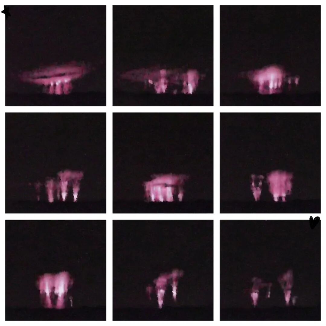 在5月10日至11日晚上,中国中部一带发生强对流天气,距离500多公里外的监控摄像头捕抓到83次的瞬态发光事件,九宫格截取的是一些比较大的事件。