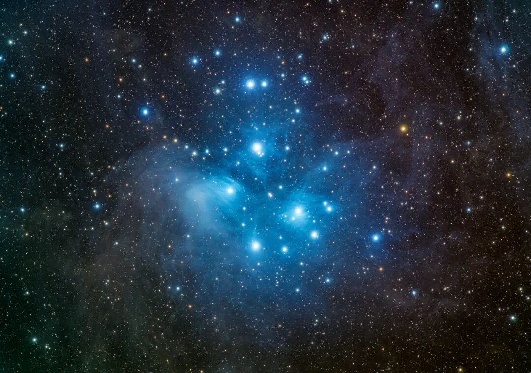 昴星团(Pleiades),梅西叶星表编号为M45,位于金牛座天区明亮的疏散星团,构成星团几个亮星在昴宿,由此得名。人类在北半球晴朗的夜空用肉眼就可以看到它,通常见到有六七颗亮星,所以又常被称为七姐妹星团。
