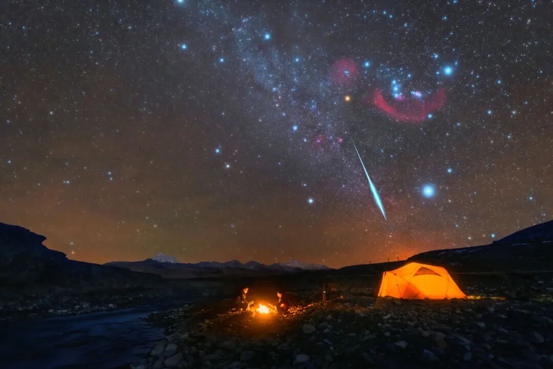 双子座流星雨之际,露营在塔公草原小溪旁,远处是雅拉雪山,点燃一堆篝火,欣赏美丽的流星雨。