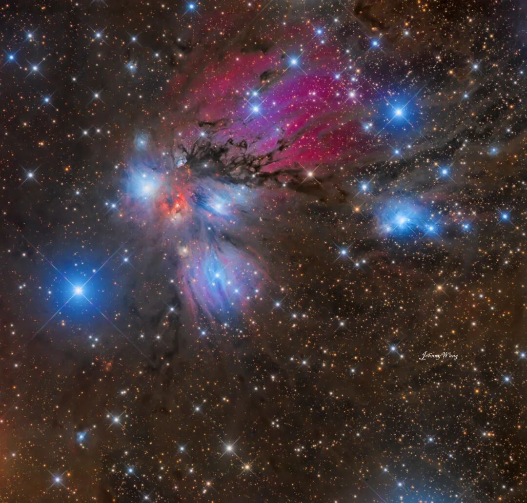 NGC2170是位于麒麟座的美丽反射星云,距我们约2400光看,直径超过15光年。它有蓝色反射区域、红色发射区域和暗云气,并与不同颜色的恒星相连,各种云气的交织十分美丽,就像一幅静物水彩画,所以它还有一个名字:麒麟座静物画。