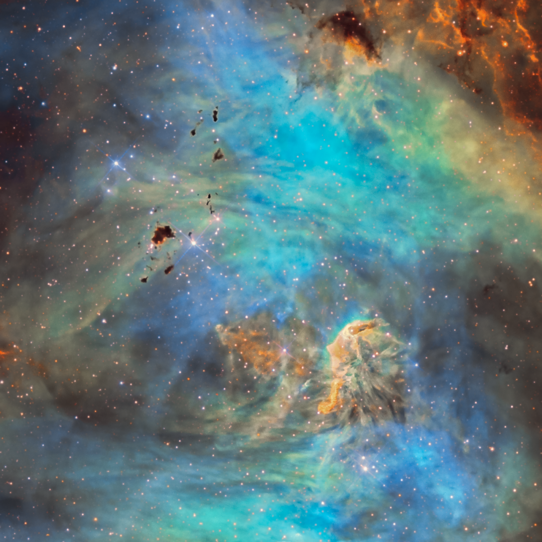 谢克瑞云球是在恒星形成区 IC2944 的密集、不透明的暗黑色尘埃云。它们会不时地出现于恒星诞生区。图中最大的一片云球大小约1.4光年,有接近十五倍的太阳质量。虽然有些云球会孕育出新的恒星,但是这一组云球却也许没有这个机会。因为它们正被邻近的炽热恒星高速地蒸发掉。
