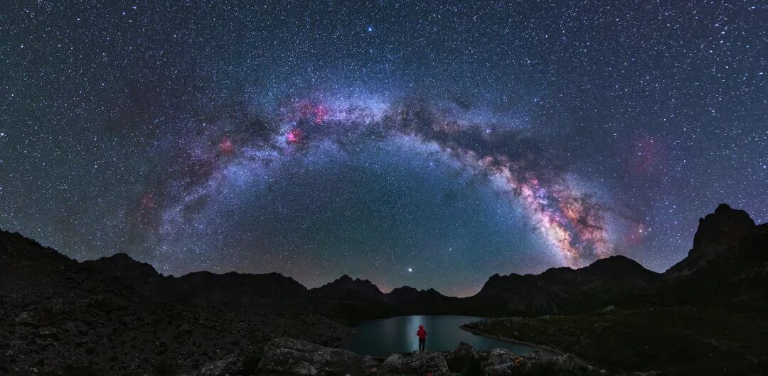 在川西北高原深处的红星海旁,遥望银河之拱横跨天际。
